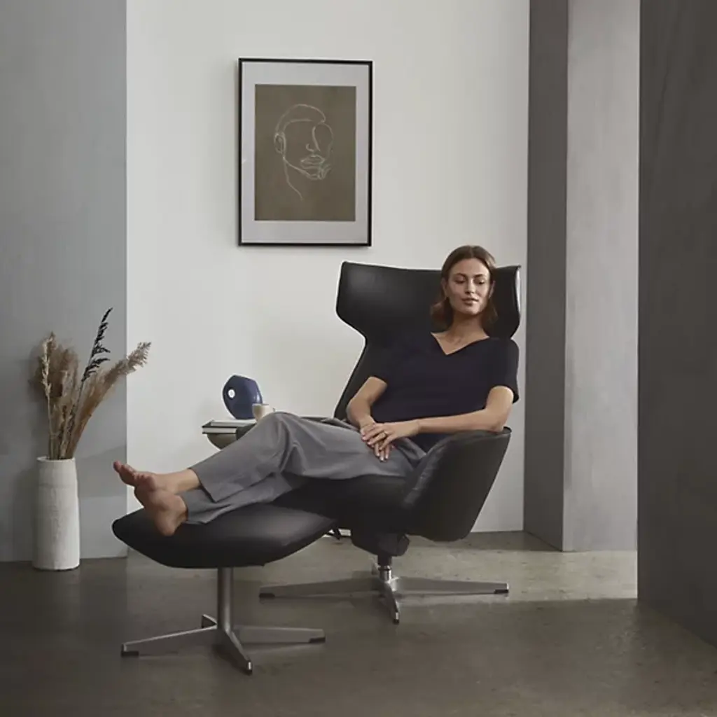 Presented by Kebe, the Palma Leather Recliner with Ottoman is a Nordic-inspired furnishing drawing from a contemporary style. Composed of genuine leather, the distinctive silhouette, tall back, and unique glide path allow the chair to perfectly adjust to your movements. Ideal for reading, the office or living area, place the Palma solo, in pairs, or more based on purpose and preference. They would make a fantastic statement in a lobby or in the study.
