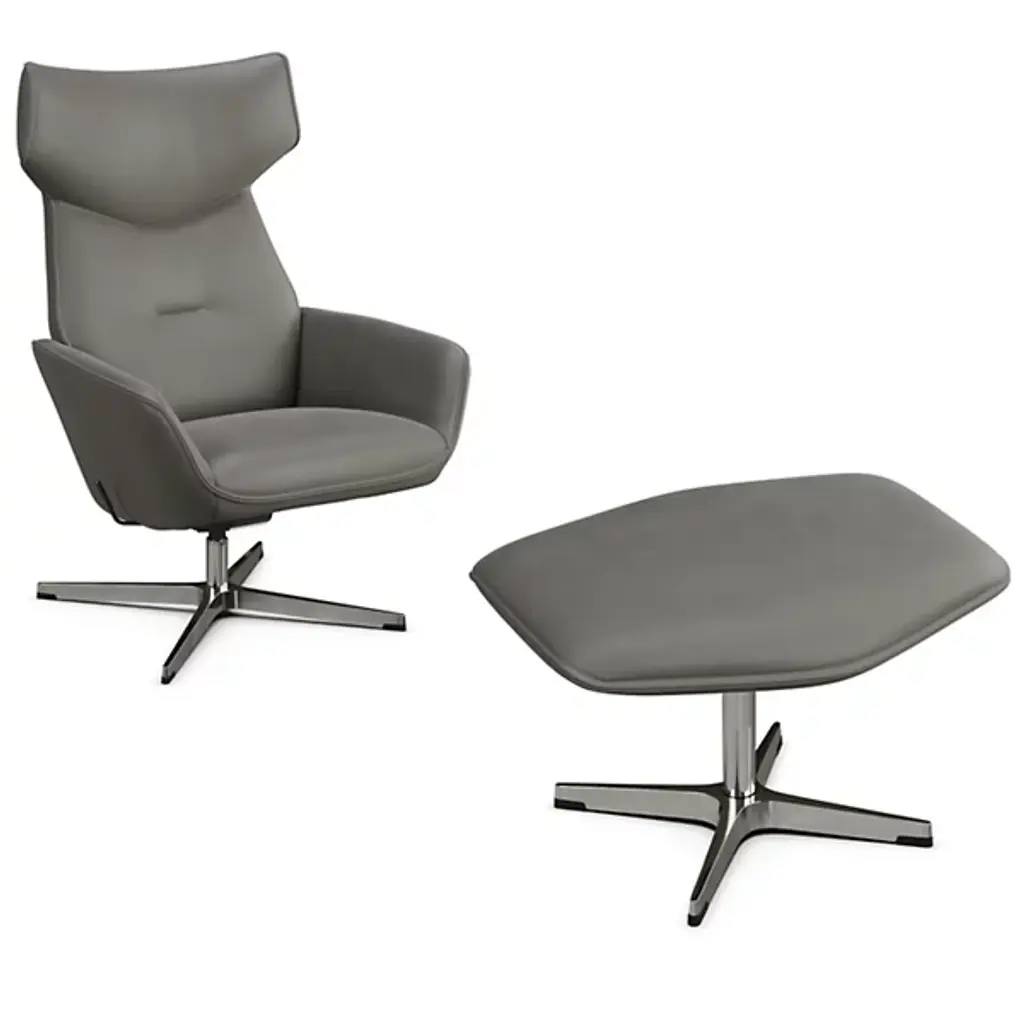 Presented by Kebe, the Palma Leather Recliner with Ottoman is a Nordic-inspired furnishing drawing from a contemporary style. Composed of genuine leather, the distinctive silhouette, tall back, and unique glide path allow the chair to perfectly adjust to your movements. Ideal for reading, the office or living area, place the Palma solo, in pairs, or more based on purpose and preference. They would make a fantastic statement in a lobby or in the study.
