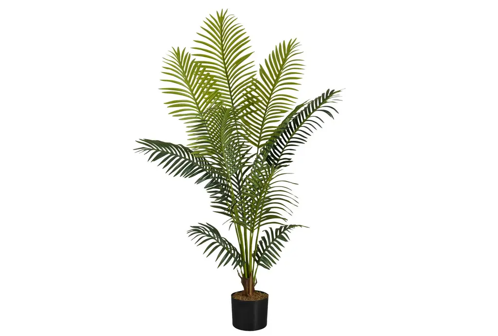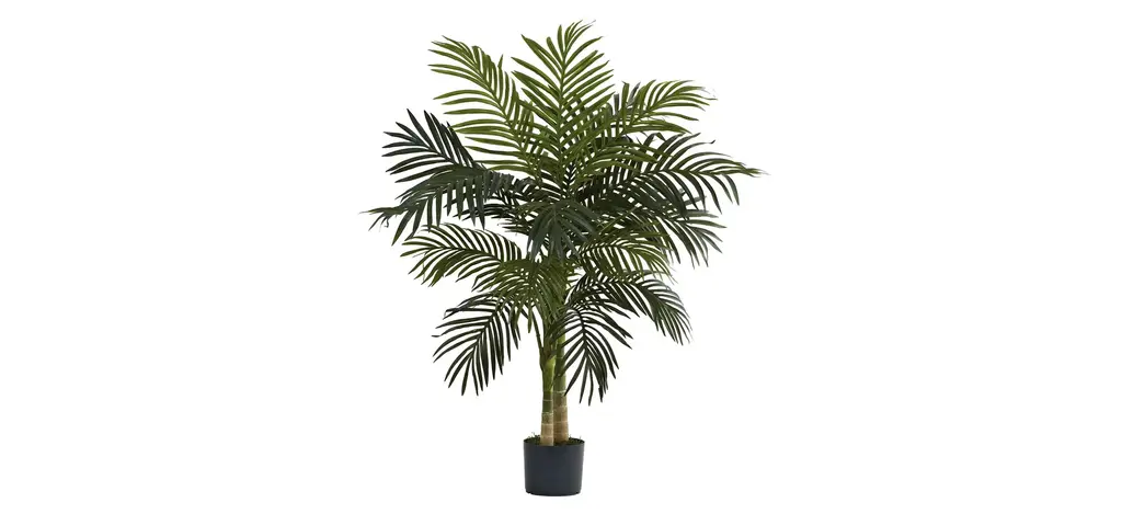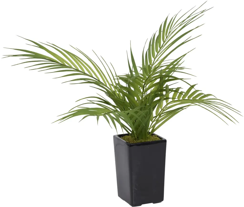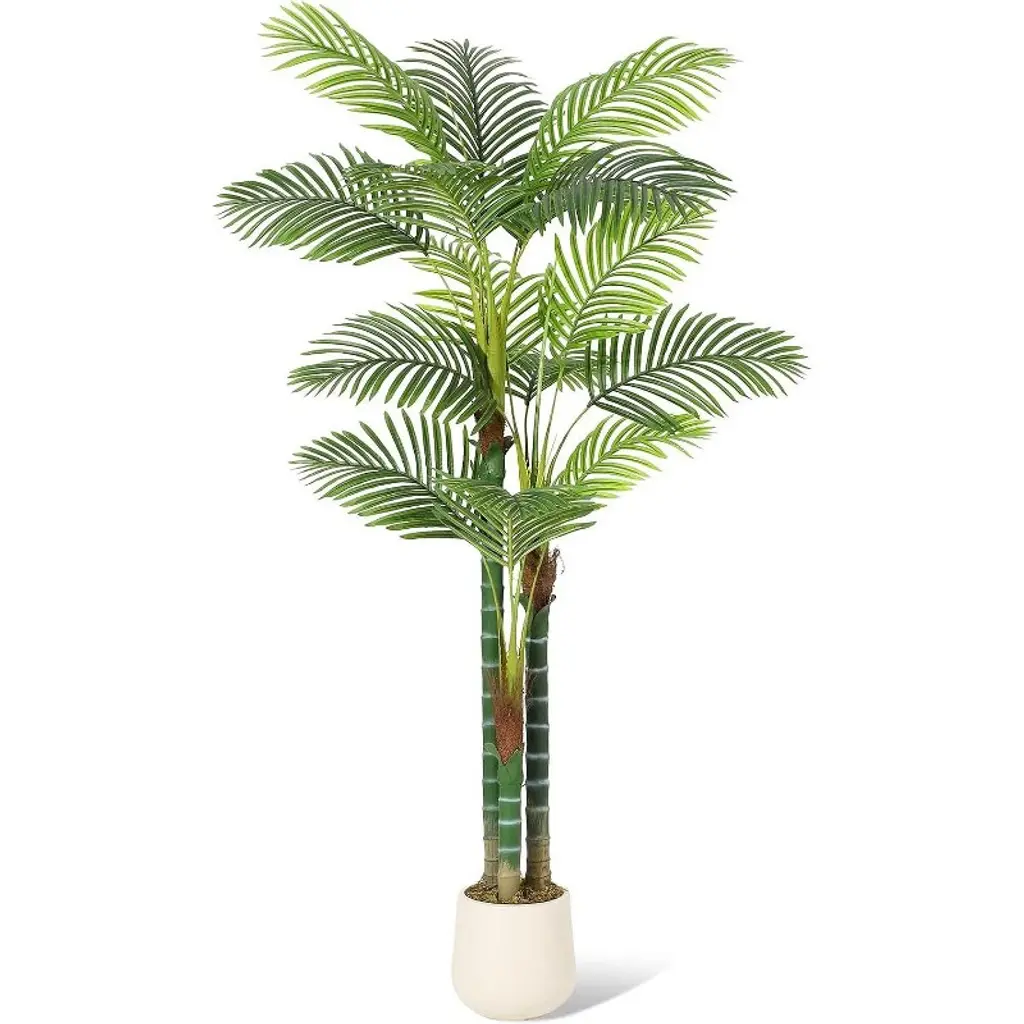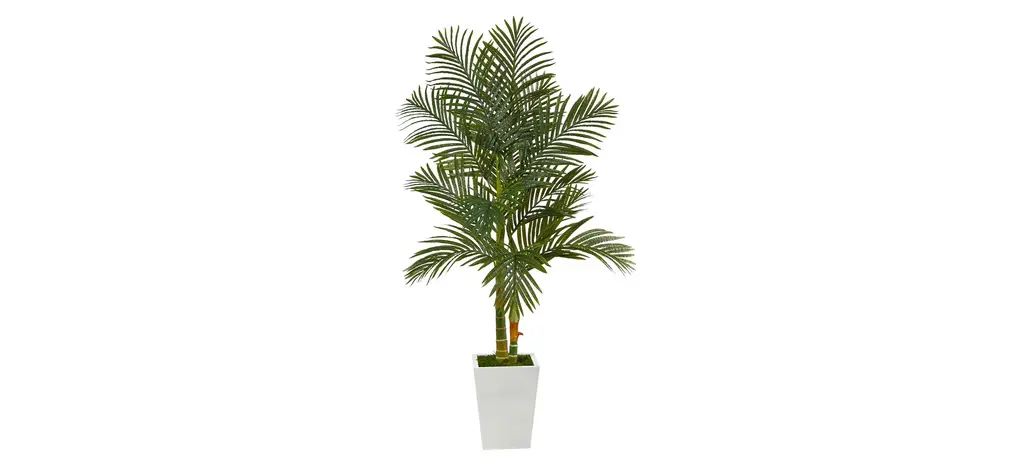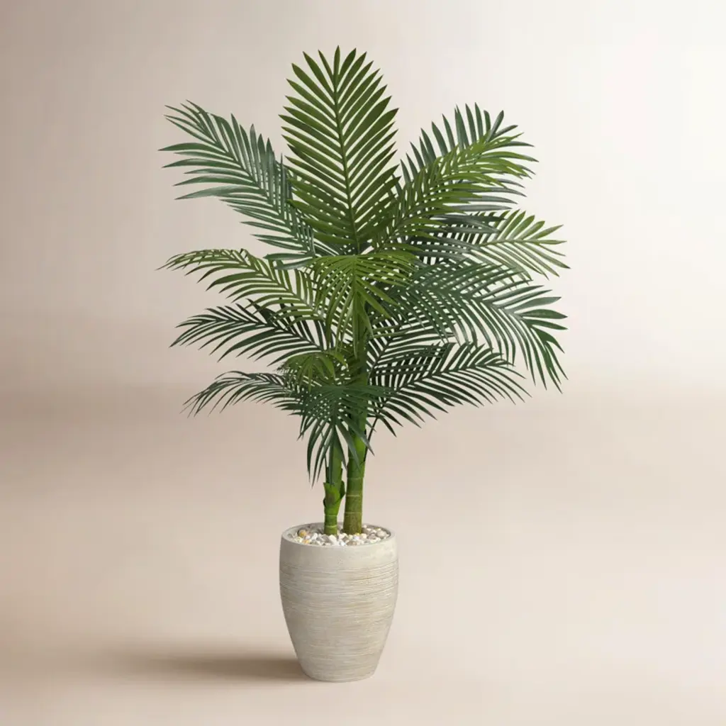 A glazed white pottery pot holds a towering areca palm secured by natural rolled white marble.