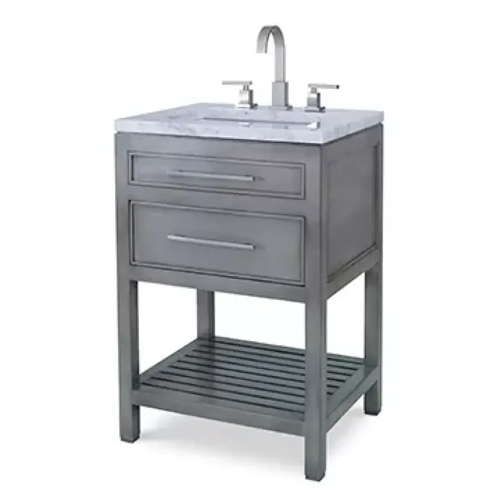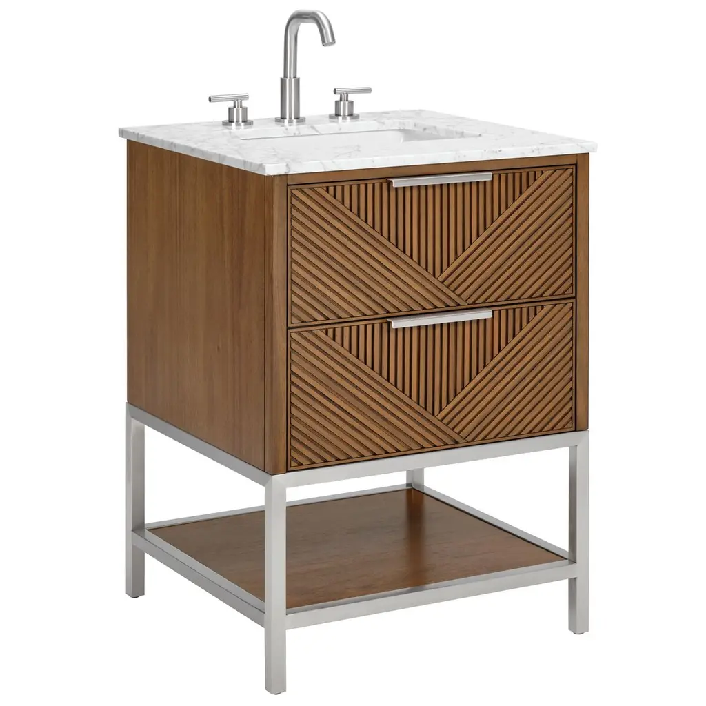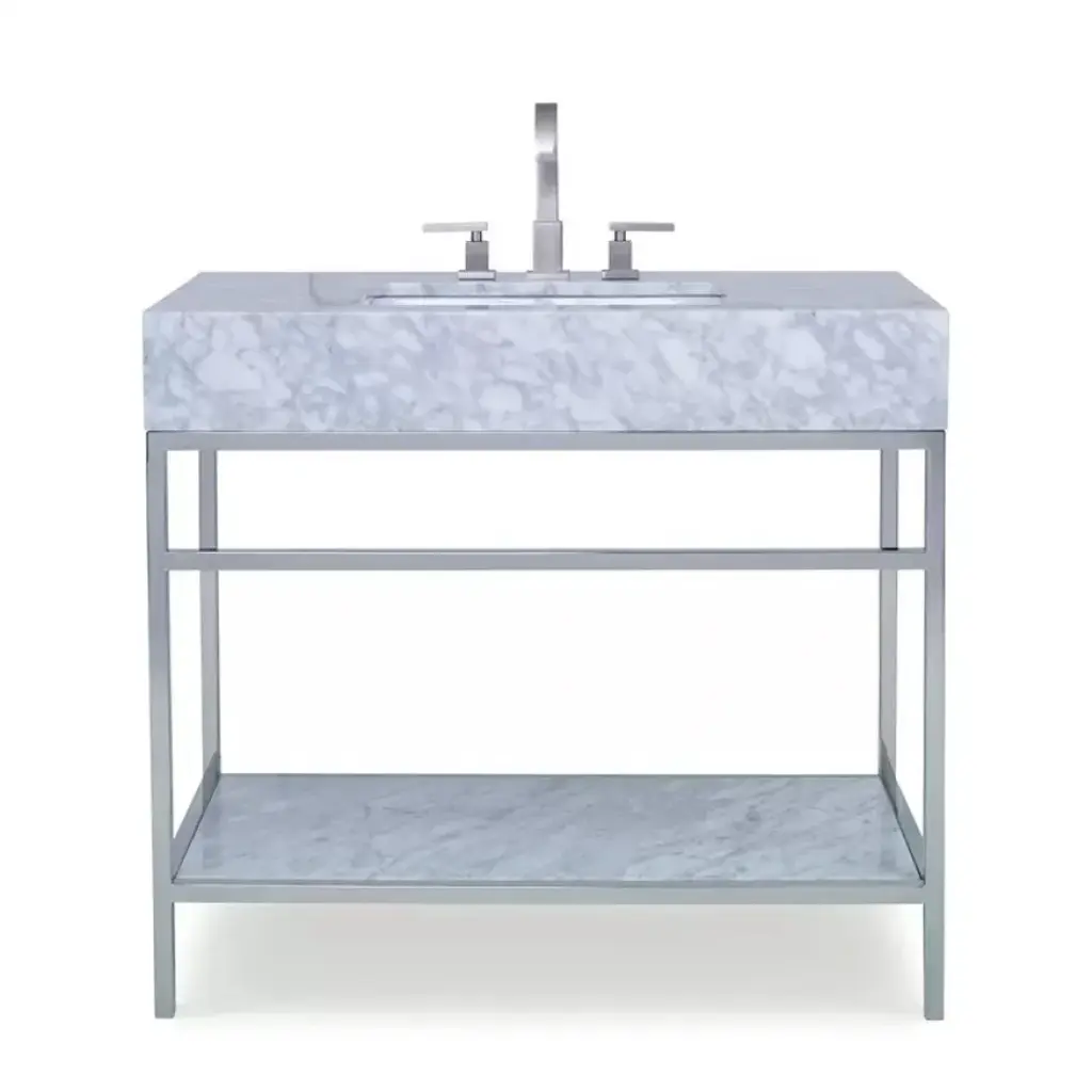 A polished stainless steel base supports the Carrera marble top with a deep marble apron. A rectangular porcelain sink is installed.