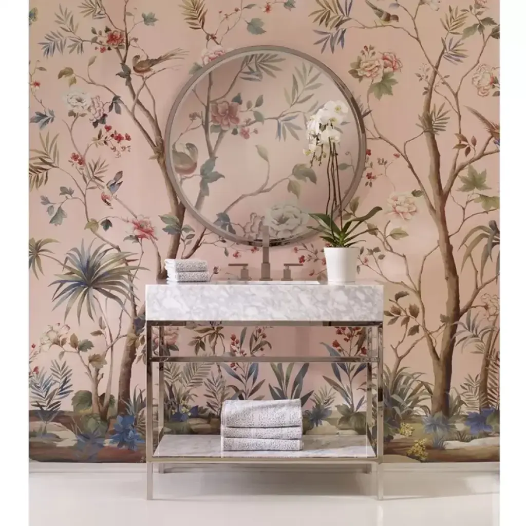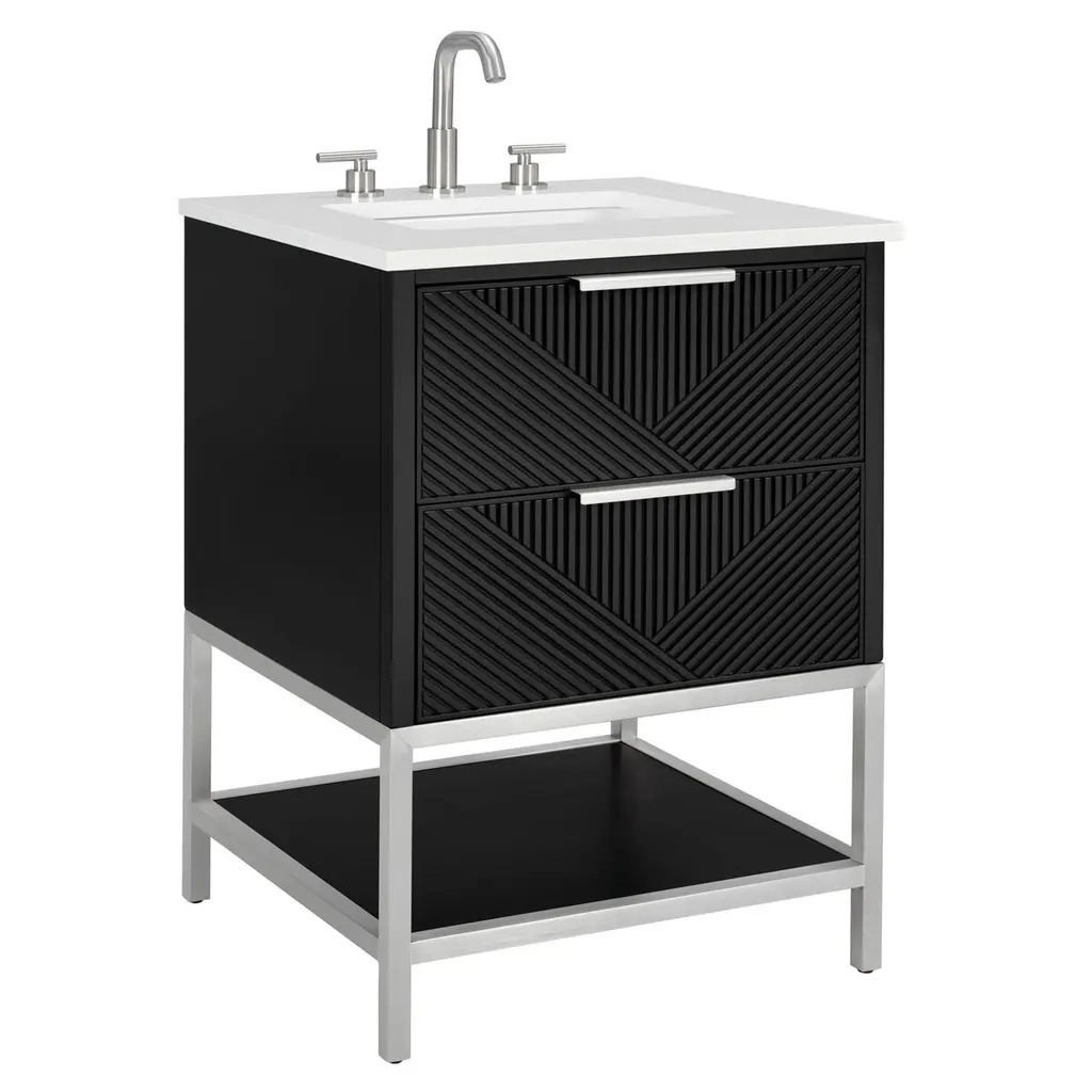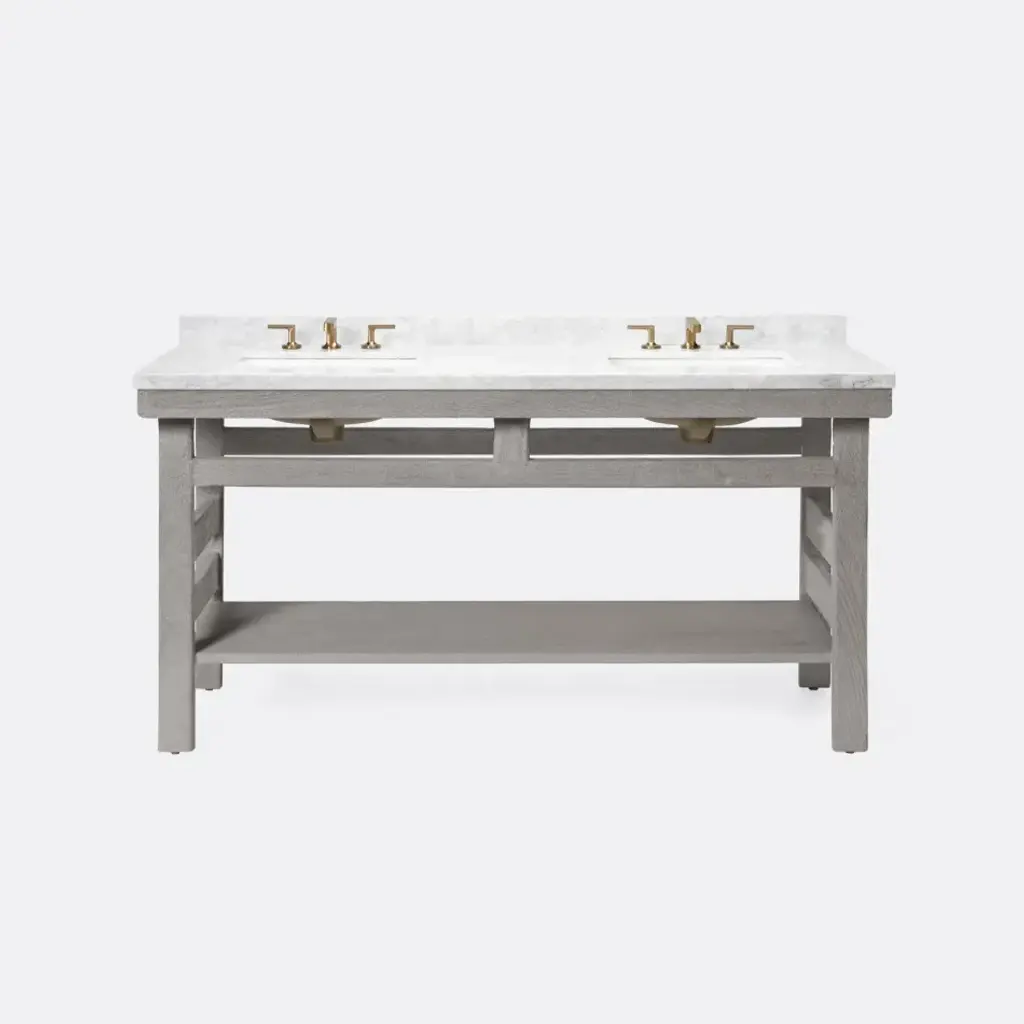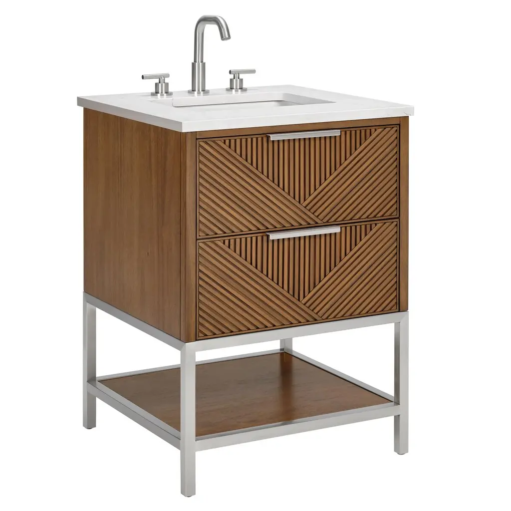 A polished stainless steel base supports the Carrera marble top with a deep marble apron. A rectangular porcelain sink is installed.