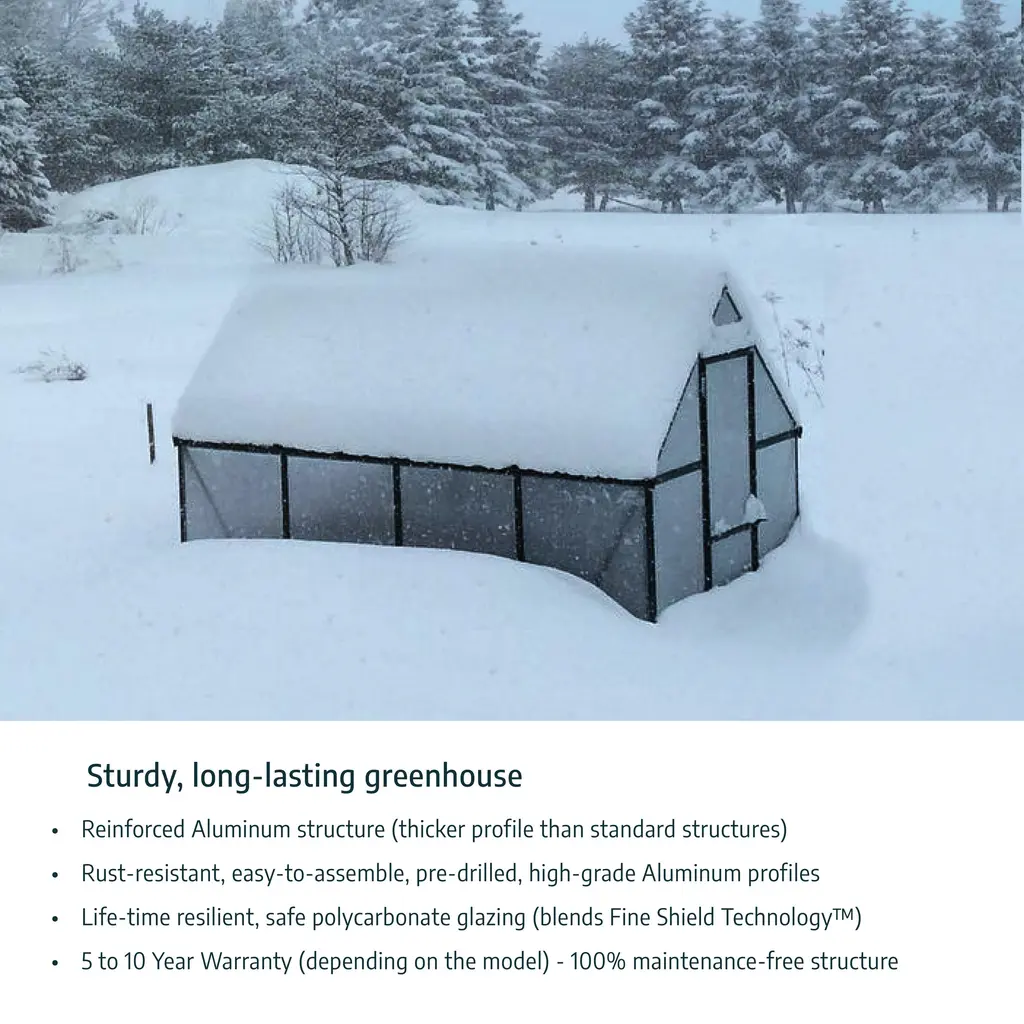The Snap and Grow 8' x 16' Greenhouse Kit provides the ideal environment for year-round plant growth. Its crystal-clear polycarbonate panels allow for over 90% light transmission while protecting your plants from harmful UV rays. The strong, rust-resistant aluminum frame and pre-assembled double door and roof vents ensure long-lasting durability and optimal air circulation. Its easy installation with SmartLock connectors and sliding panels' assembly system, built-in gutters, and included anchoring kit make this greenhouse a smart choice for any gardener.Features:Additional Details: