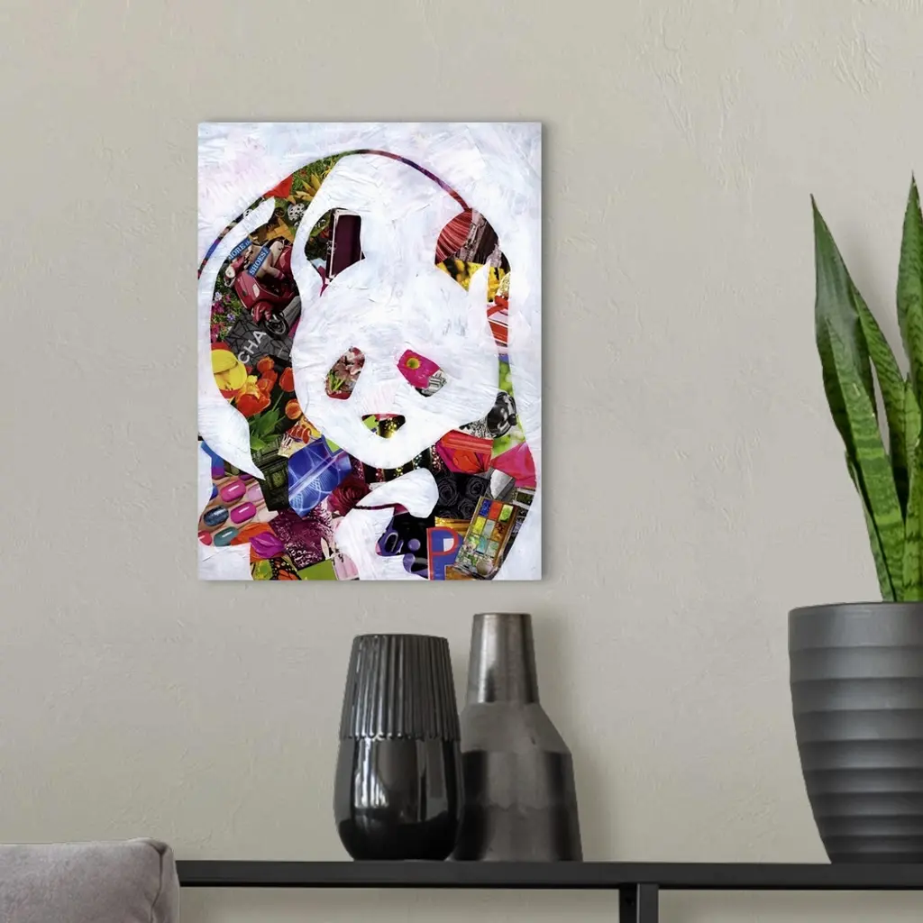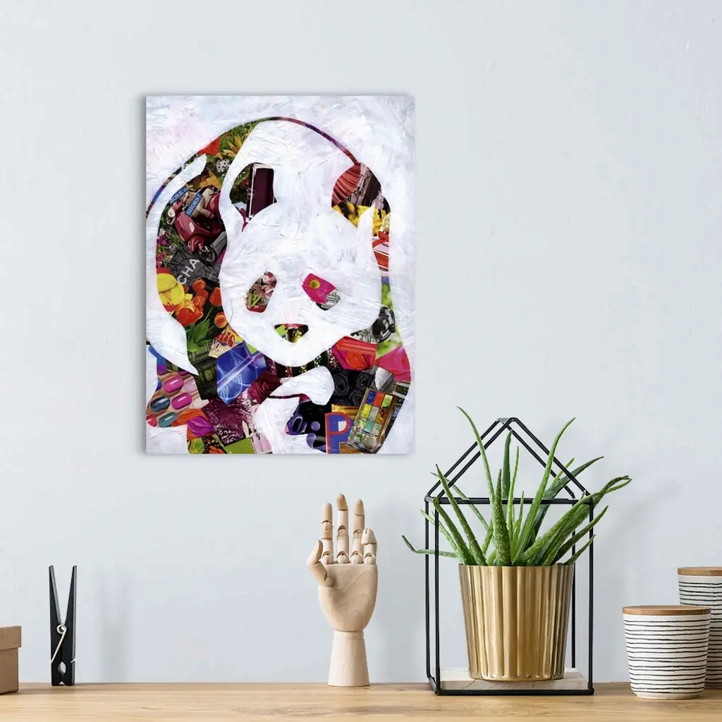 Multimedia collage of magazine clippings and paint of a cute panda bear.