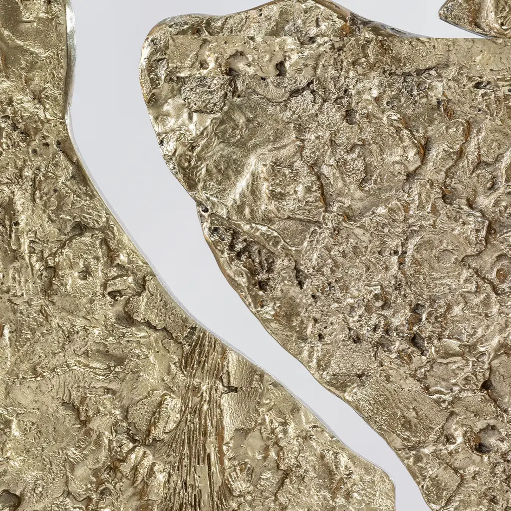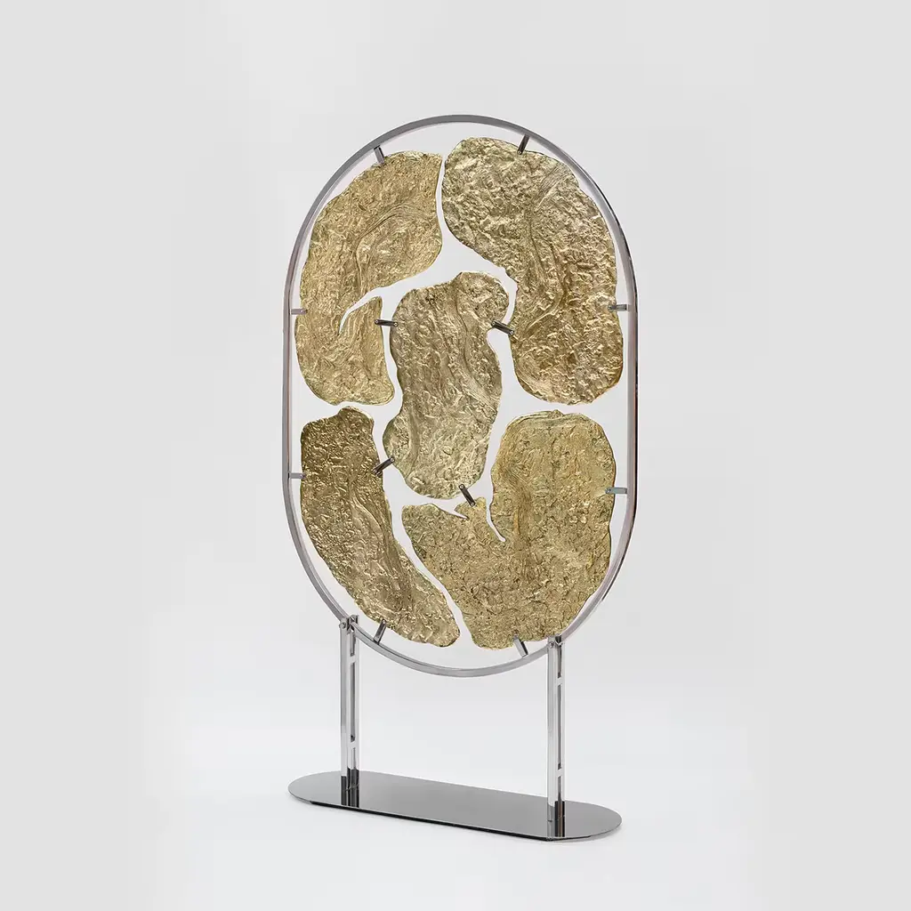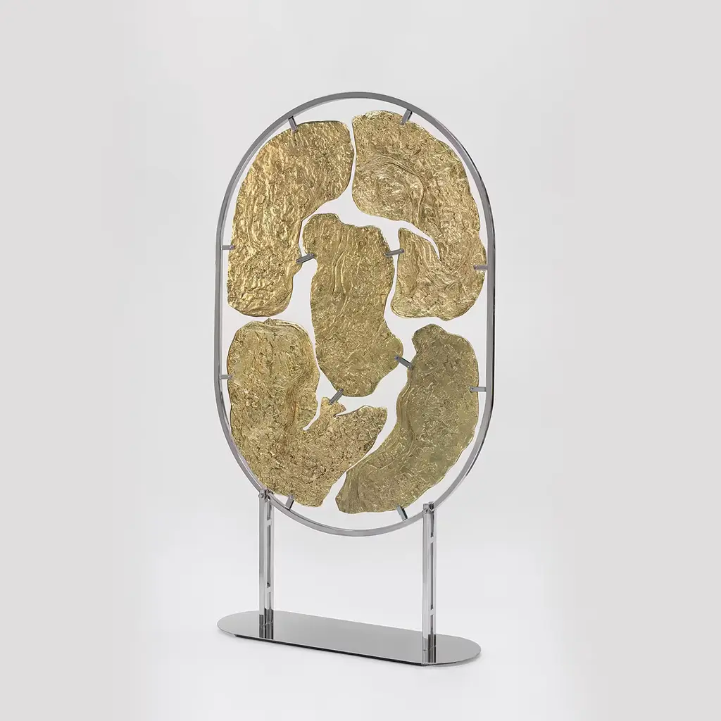 The Pangea decorative wall-divider, part of Wanderart's Lunar Edition and first showcased at Milan Design Week 2024, features a suspended composition of continents, symbolizing unity through their curving intersections. This contiguous land mass creates a contemplative dialogue, resembling a meditative gong. The divider is crafted with a stainless steel frame and aluminum lost-wax cast slabs, plated in brass, showcasing exquisite artisanal detailing.