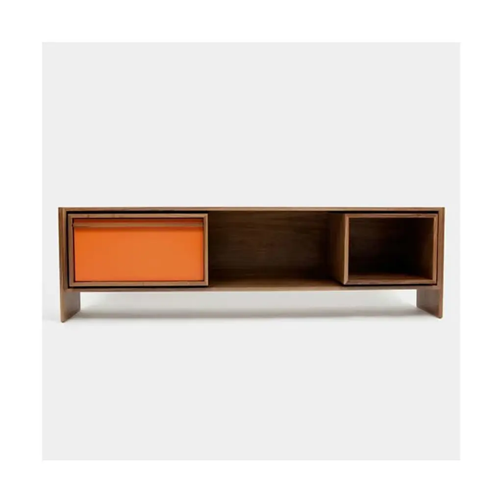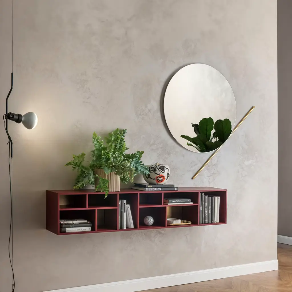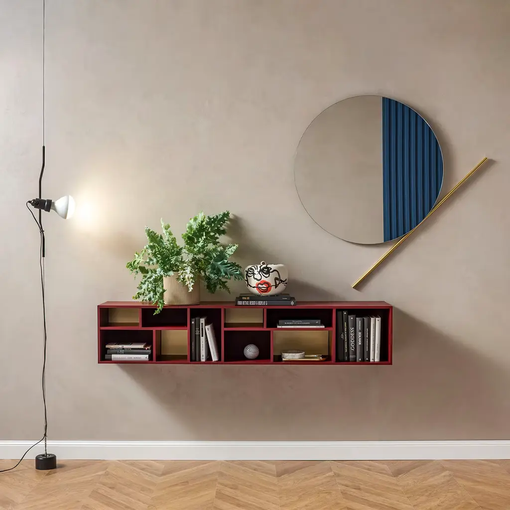 A clever addition to an entryway as a suspended console, this wall unit allows for satisfying storage needs while seducing with its regal tones. An intriguing Marsala-red shade was selected as lacquer for its MDF structure, its rigorous minimalism counterbalanced by a dynamic assortment of the open units. Brass-finished metal inserts add brightness and glamour to the piece.
