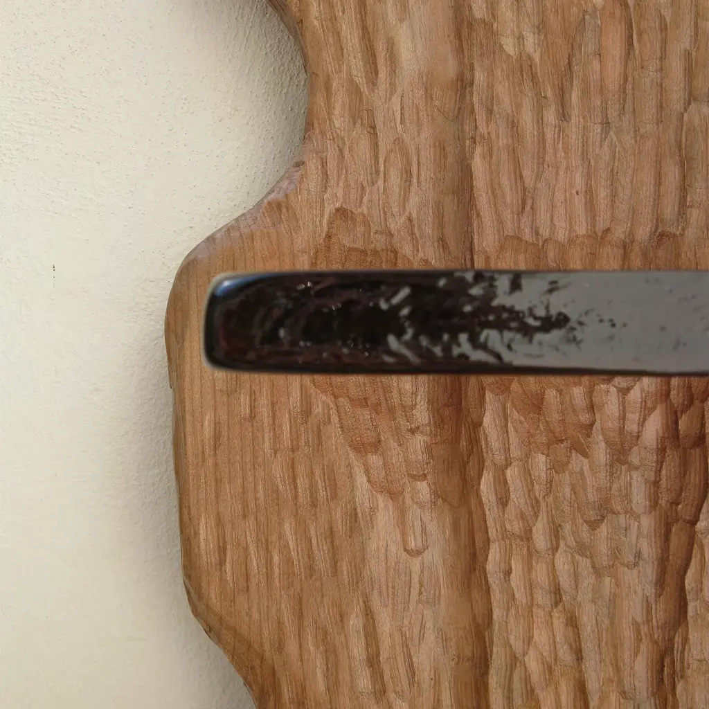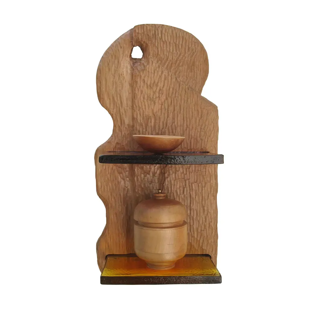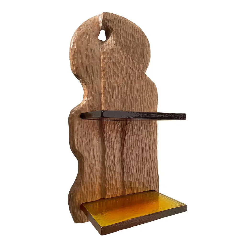 Painstakingly carved by hand, this multipurpose cherry rack brims with the allure of an authentic objet d'art. The deliberately irregular profiles further enhance its artistic feel, while the pair of handmade shelves in red and yellow glass suggest its practical use. Signed by the artist, each piece is entirely unique.