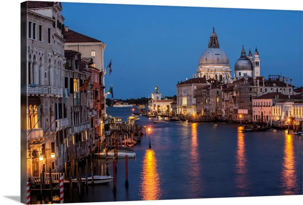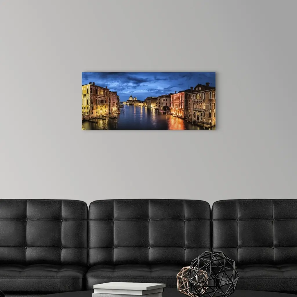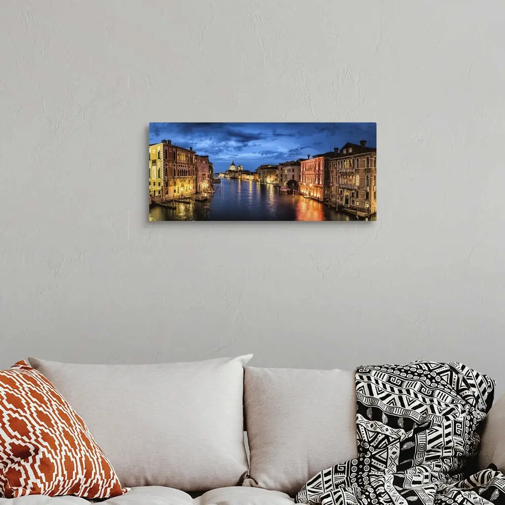 Panorama from the Academia Bridge after dark in Venice, Italy.