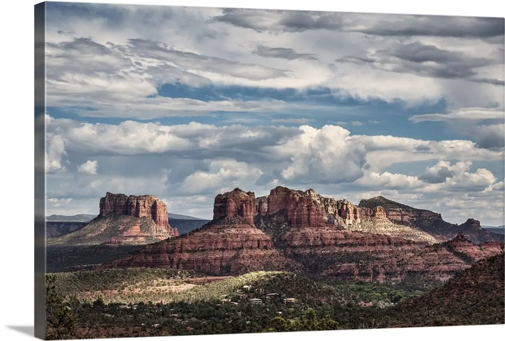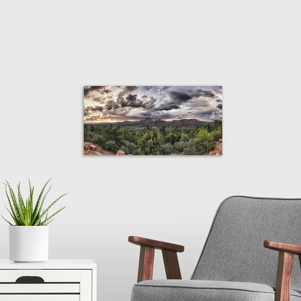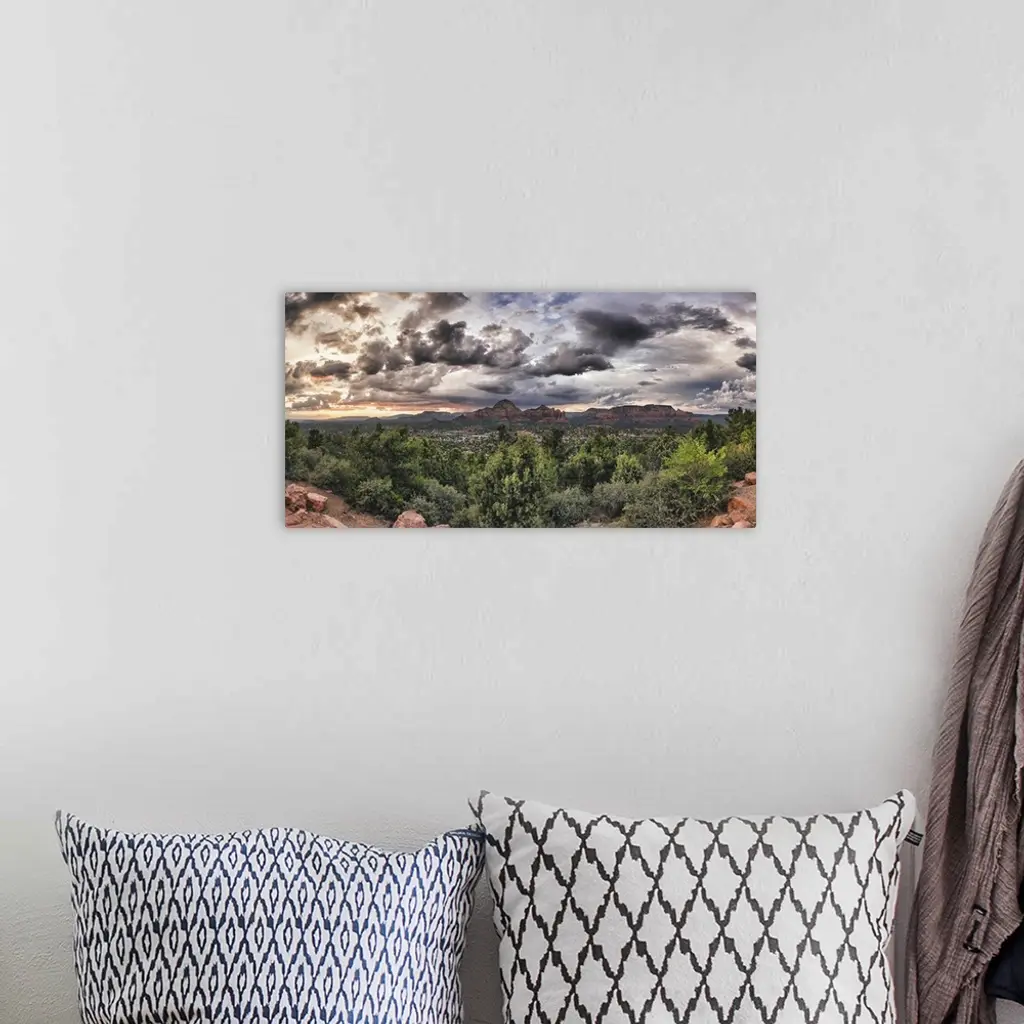 Panorama of clouds and red rocks in Sedona, Arizona.