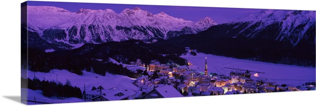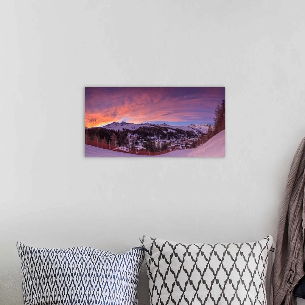 Panorama Of The Alpine Village Of Madesimo And Snowy Ski Slopes At Sunset
