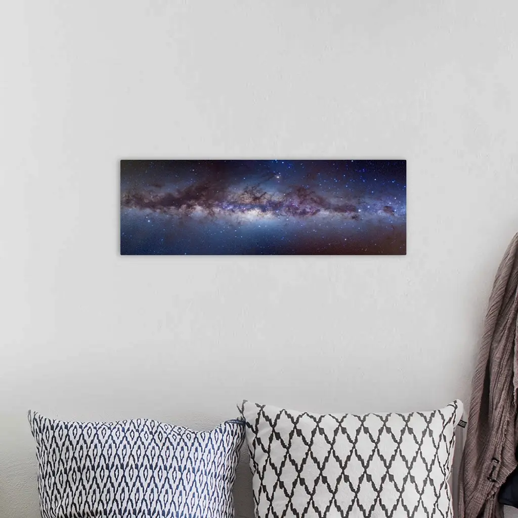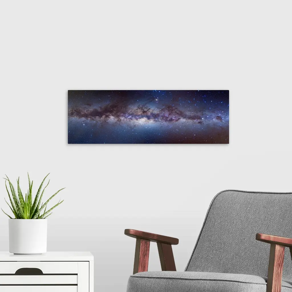 A panorama of the center of the Galaxy portion of the southern hemisphere Milky Way, from Crux at right to Aquila at left. Note the sweep of bright blue stars from Scorpius to Orion but angled above then across and below the Milky Way, this is Gould's Belt of new hot stars near us.