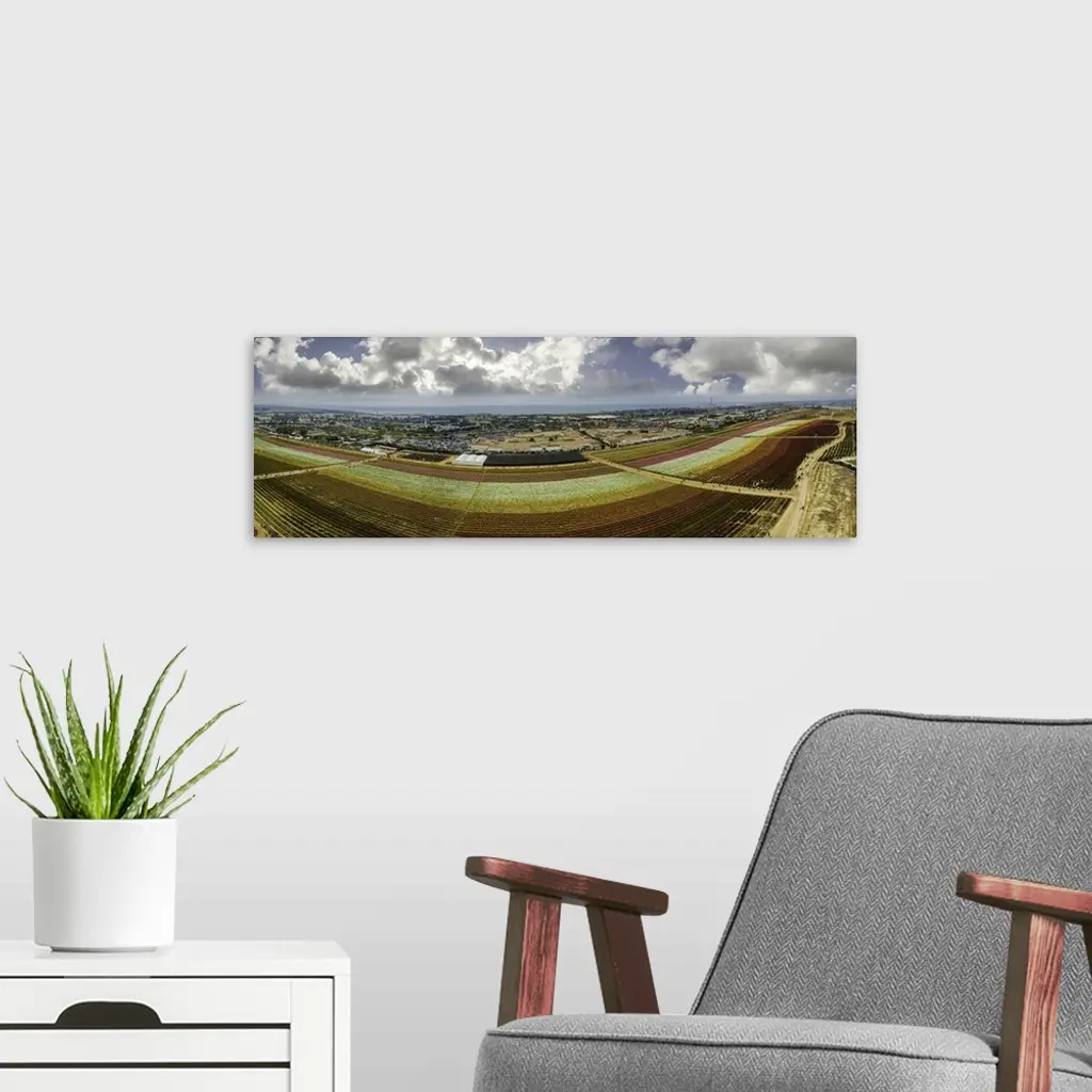 The famous Carlsbad Flower fields in Southern California. This is a 4 image aerial panoramic looking toward the Pacific Ocean in the distance.