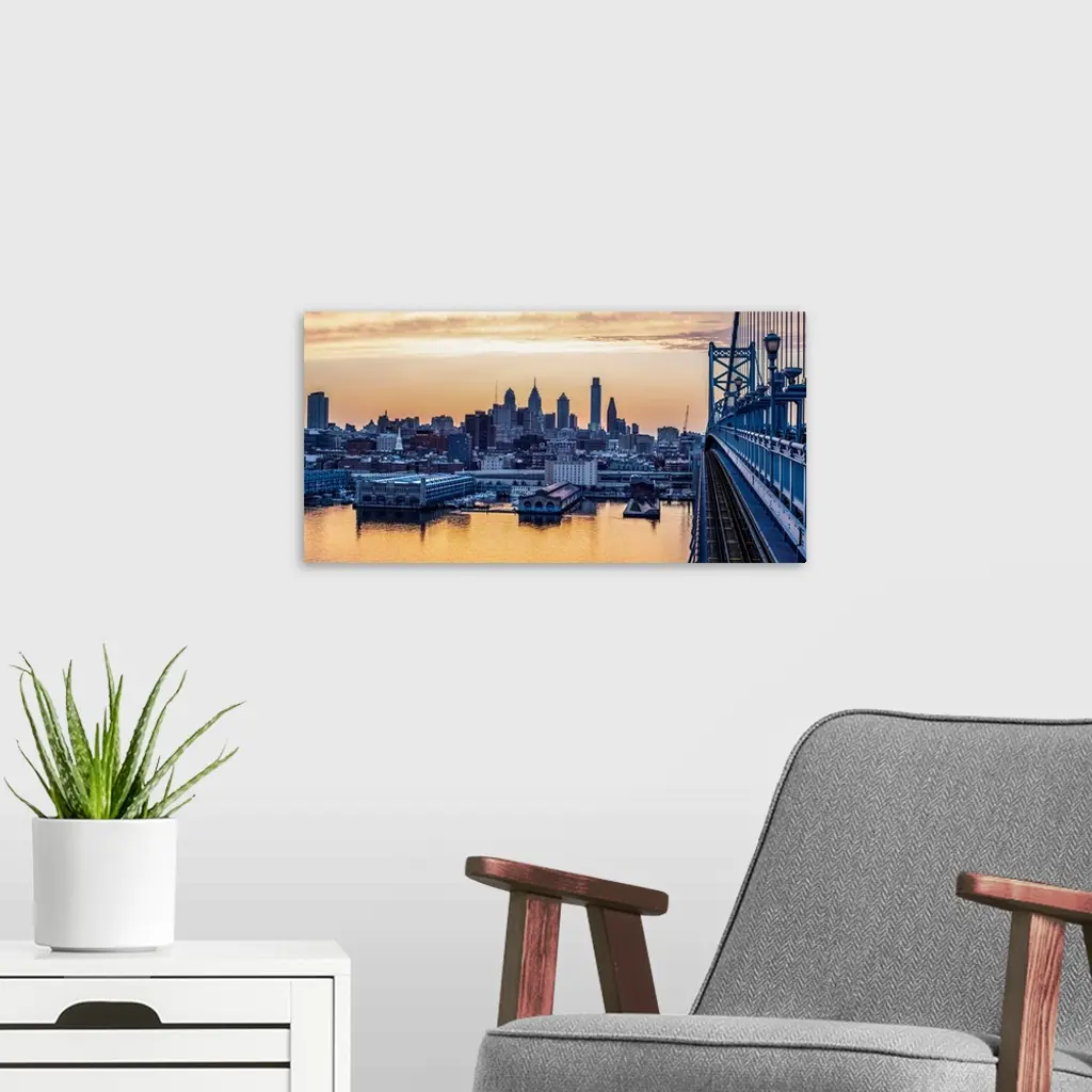 View of Philadelphia's city skyline against a dewy melon colored sky.