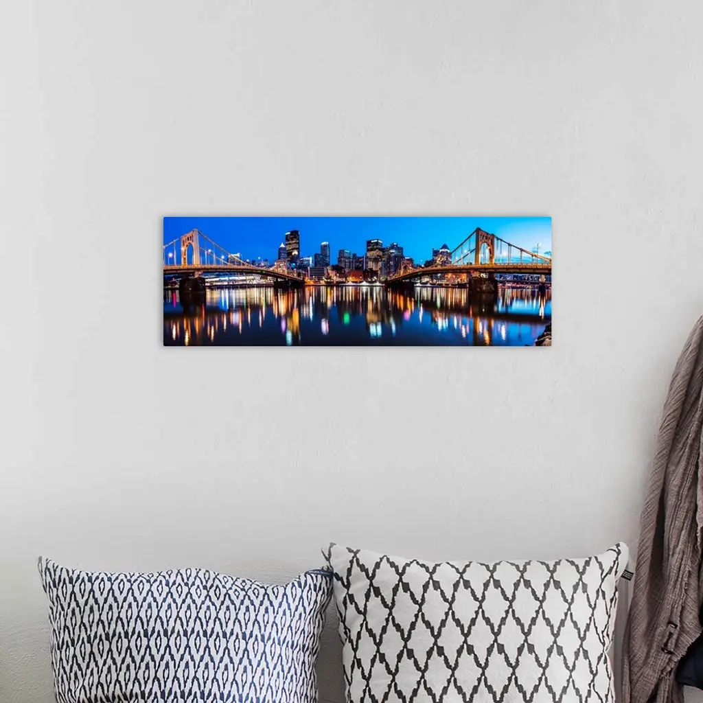 Panoramic photo of downtown Pittsburgh at night with the Rachel Carson Bridge and the Andy Warhol Bridge over the Allegheny River.