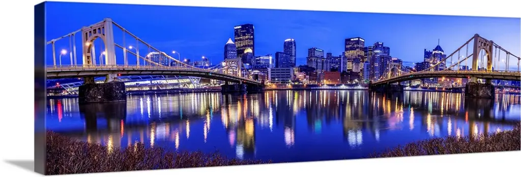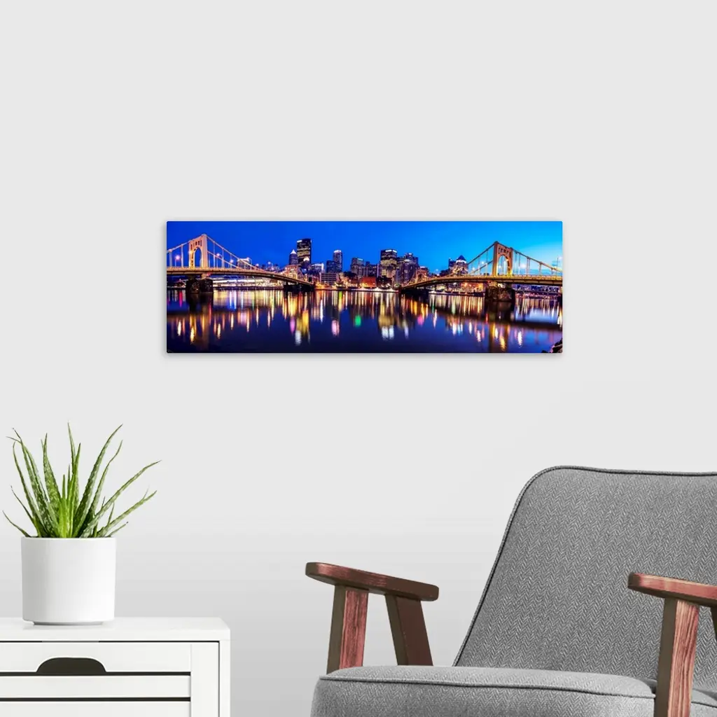 Panoramic photo of downtown Pittsburgh at night with the Rachel Carson Bridge and the Andy Warhol Bridge over the Allegheny River.