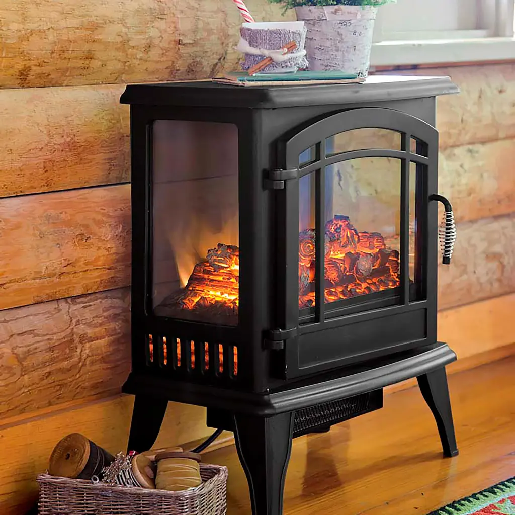 Our attractive stove heater has three clear sides so you can enjoy the realistic electric flames from every angle. Both useful and beautiful, this engaging design features a 4,600 BTU quartz infrared heater with thermostat control. This super-efficient technology warms you instantly and directly. Rather than warming just the air, our quartz infrared stove actually warms you with the infrared waves. The flames operate independently for ambiance with or without heat. Our Panoramic Stove is designed to heat up to 1,000 square feet, and its compact size makes it easy to move from room to room. A great functional accent!