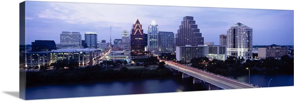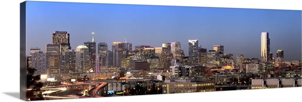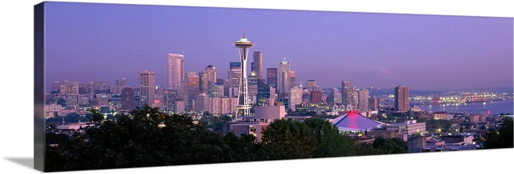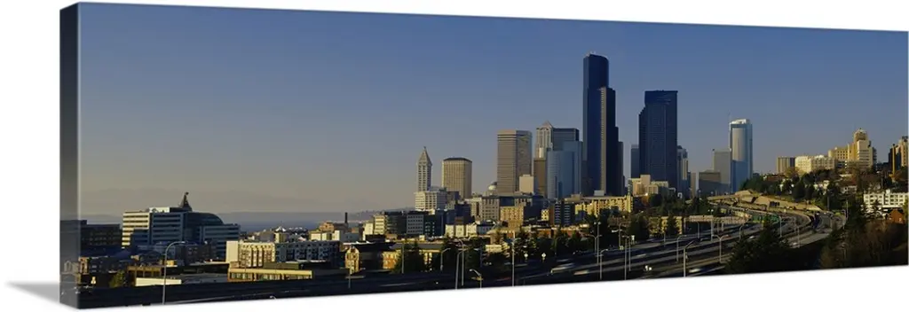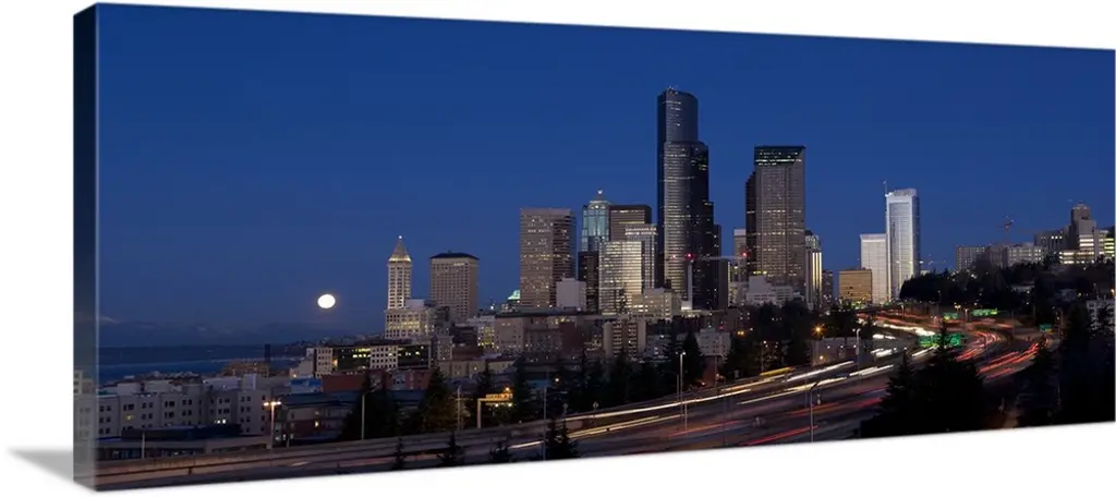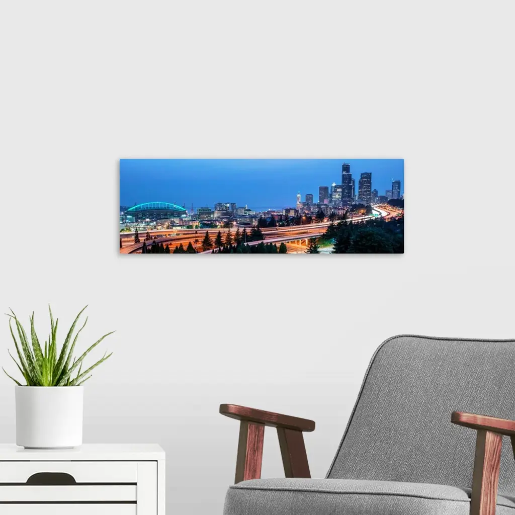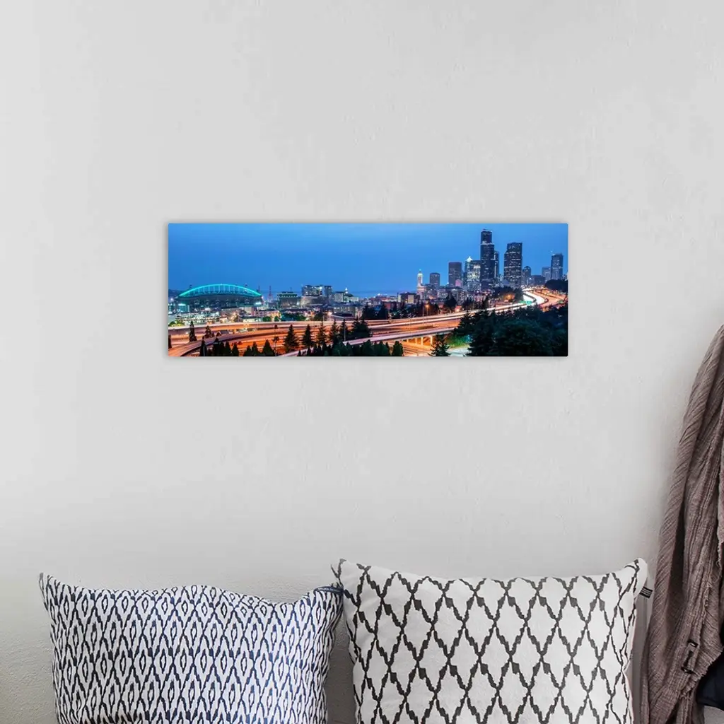 Panoramic photograph of the Seattle skyline with the stadium on the left and light trails from traffic on the highway.