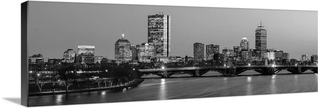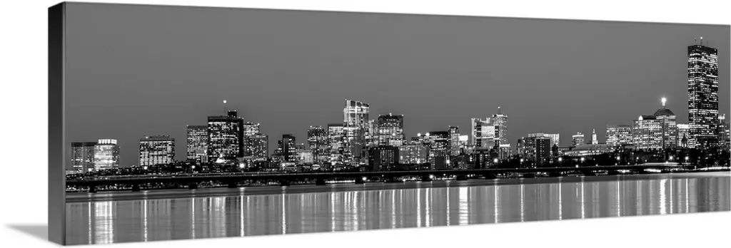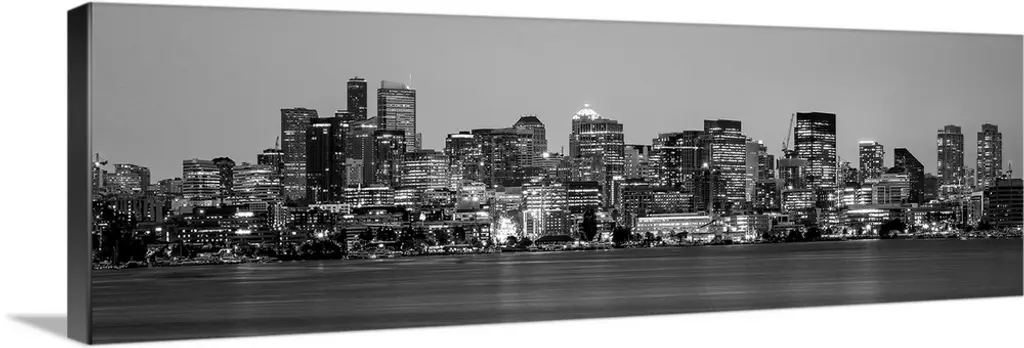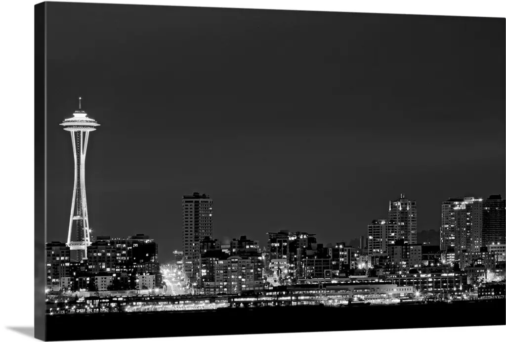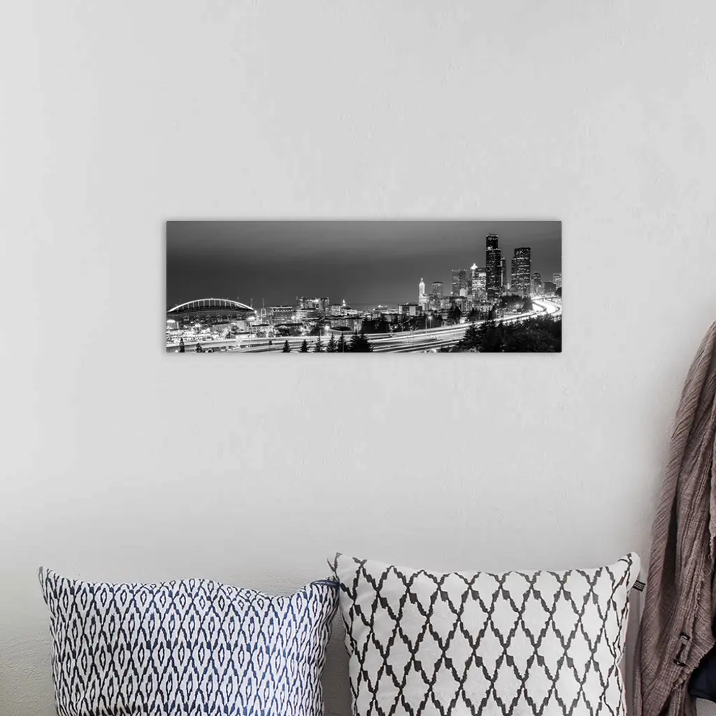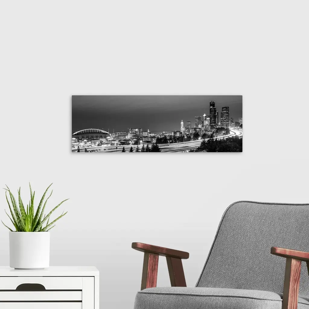 Panoramic photograph of the Seattle skyline with the stadium on the left and light trails from traffic on the highway.
