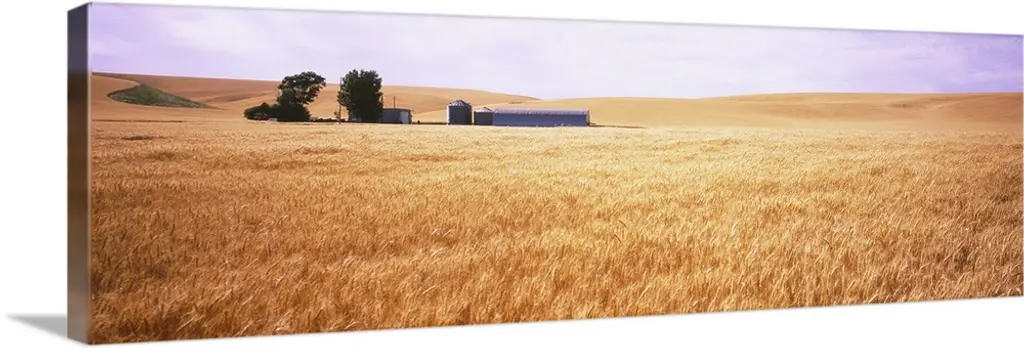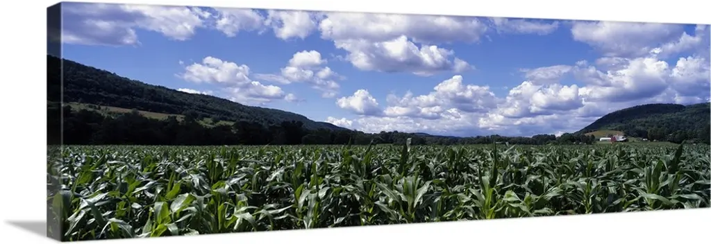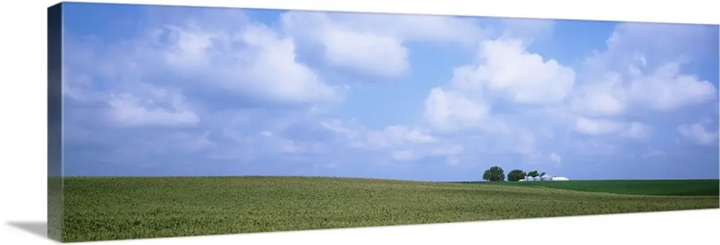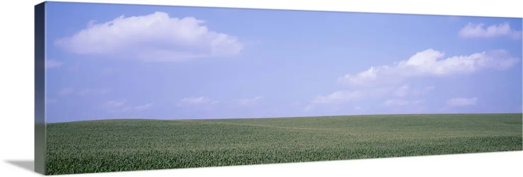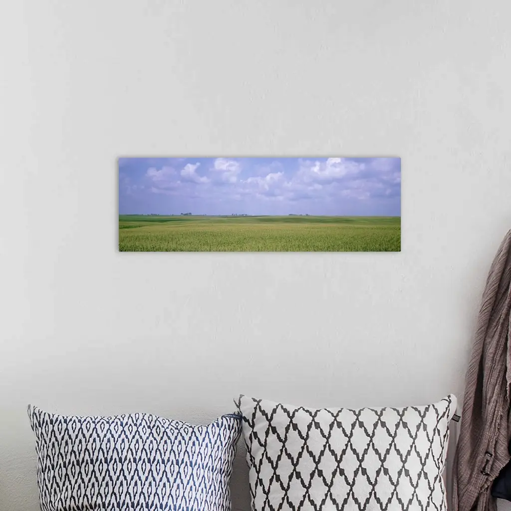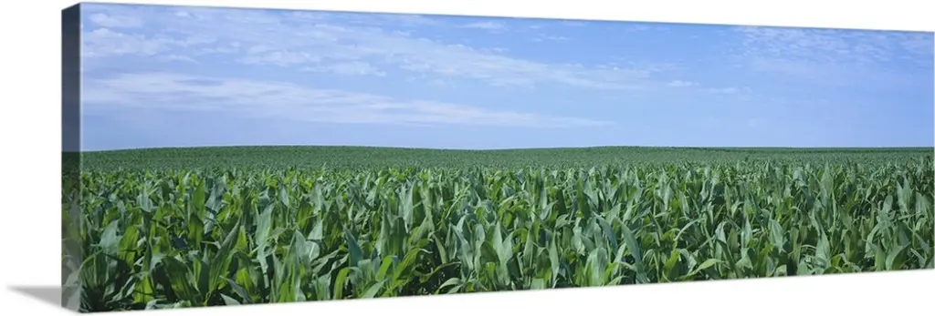 Giant horizontal photograph of a vast, green cornfield beneath a light blue sky, in Iowa.