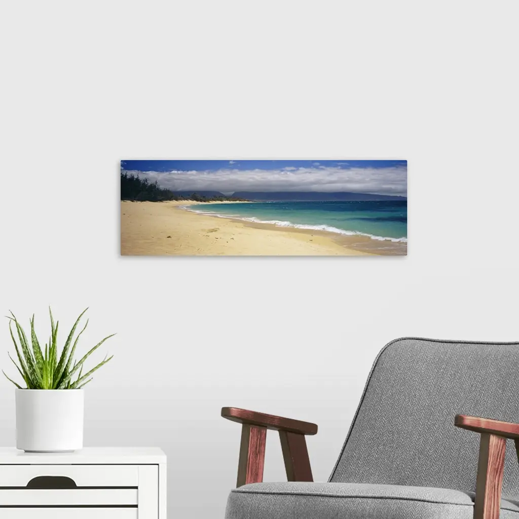 Wide angle photograph on a large wall hanging of clear blue waters along the beach in Maui, Hawaii, a tree line in the background, beneath a blue, cloudy sky.