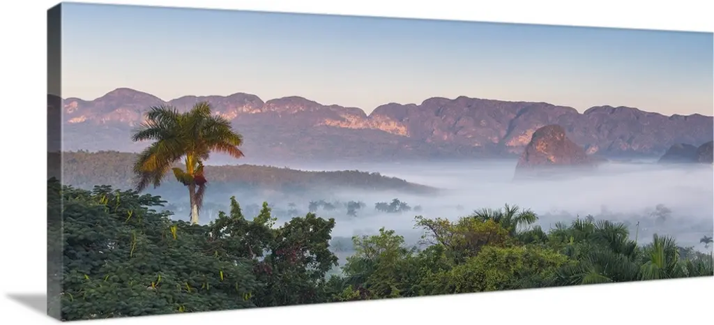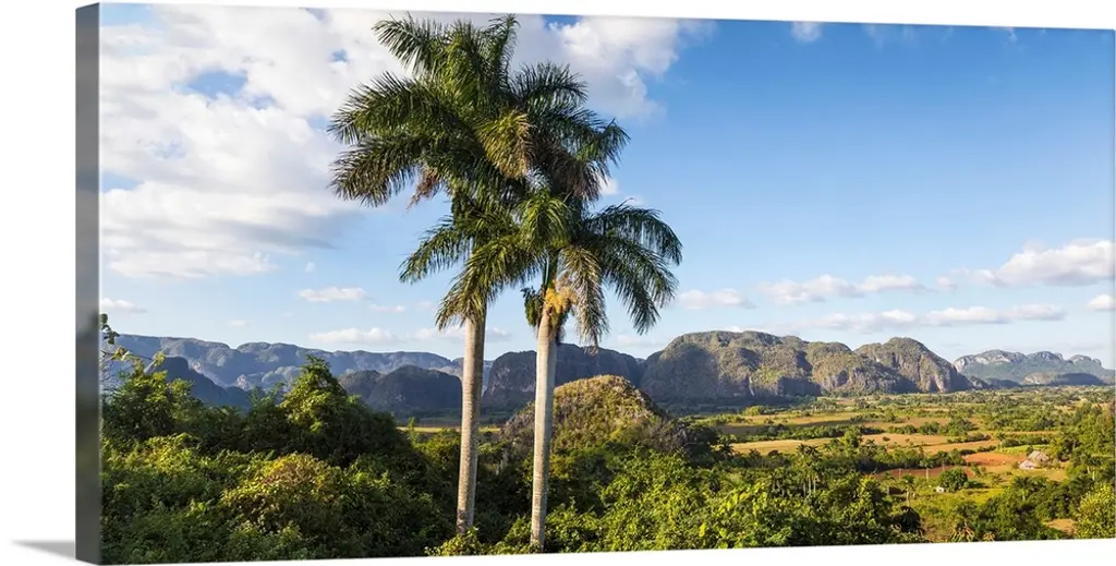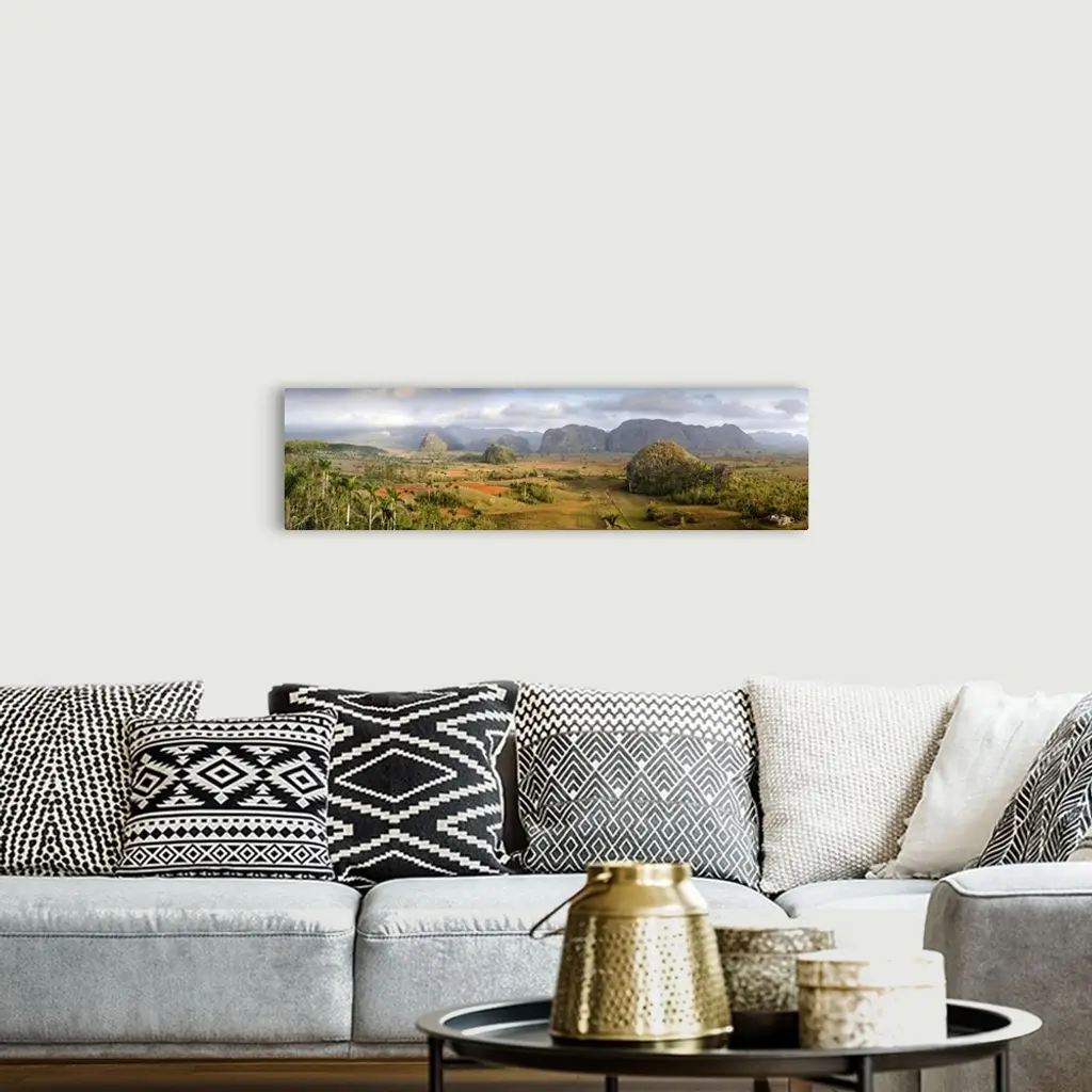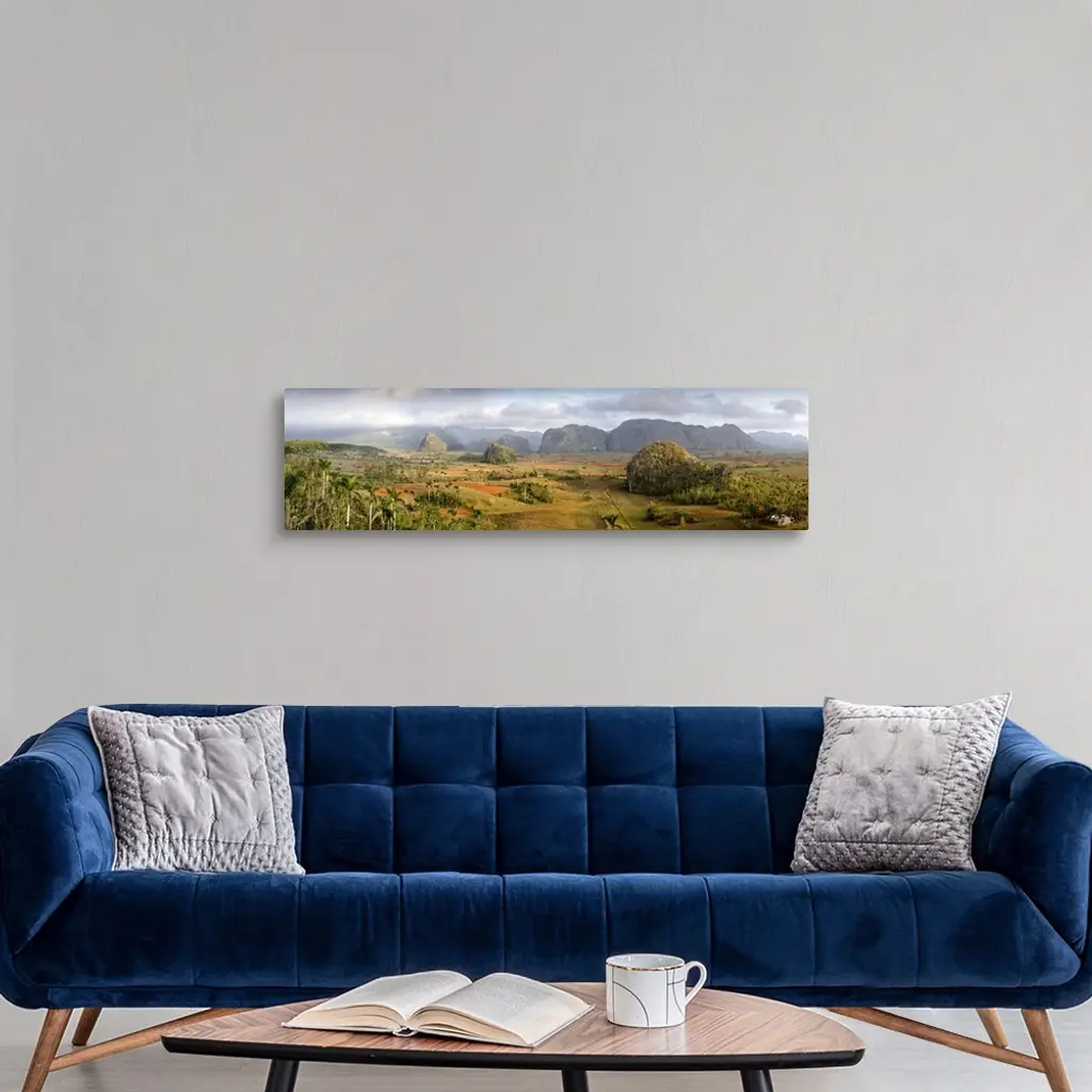 Panoramic view of the Vinales Valley showing limestone hills, Vinales, Cuba wall art for home and office decor. Discover canvas art prints, photos, mural, big canvas art and framed wall art in GreatBigCanvas.com's varied collections.