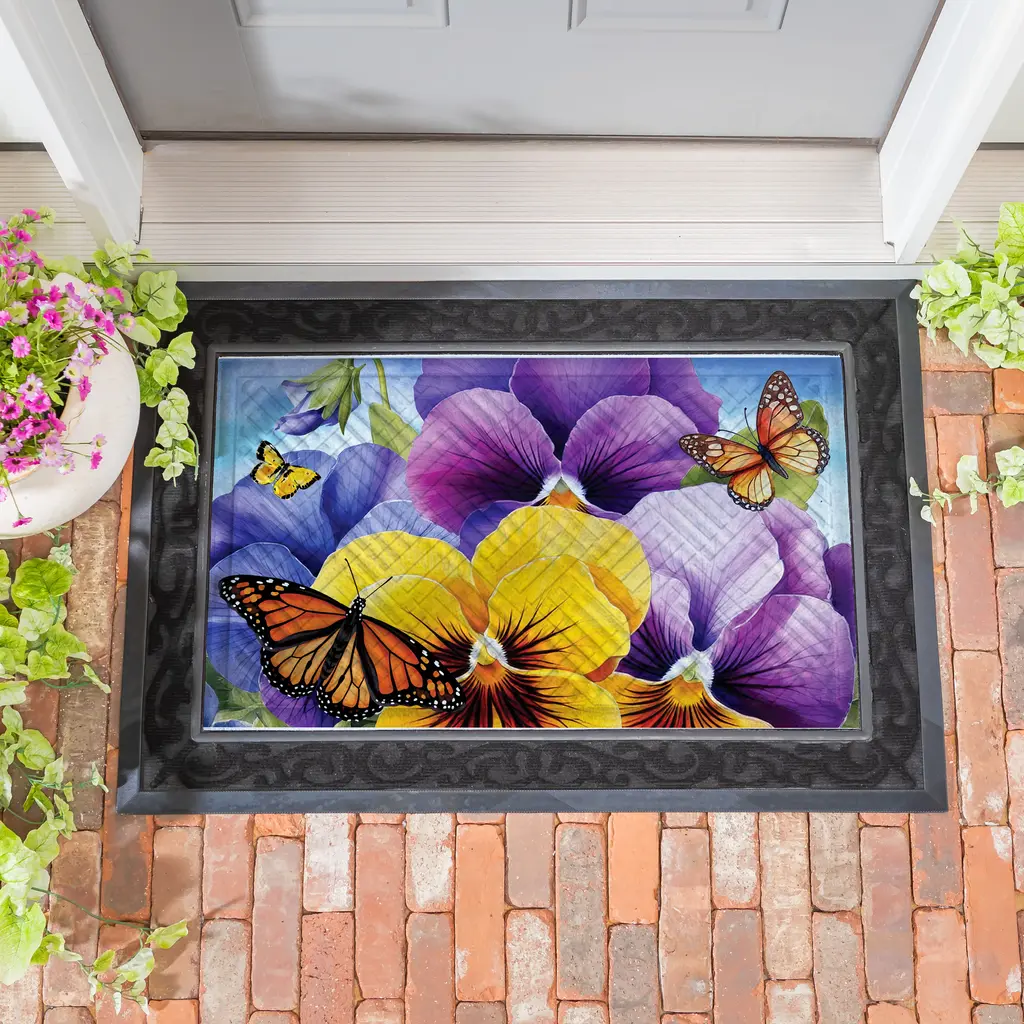 Sweep guests off their feet with our beautifully made embossed mats! Made with bright pops of color that are perfect for the season, this mat will put pep in anyone's step. Evergreen's embossed mats are crafted from outdoor-safe polypropylene and feature a rubber anti-slip backing. The embossed texture makes this mat more effective in trapping dirt, perfect for indoor or outdoor use. Place it in a high-traffic area to keep debris out of the home.
