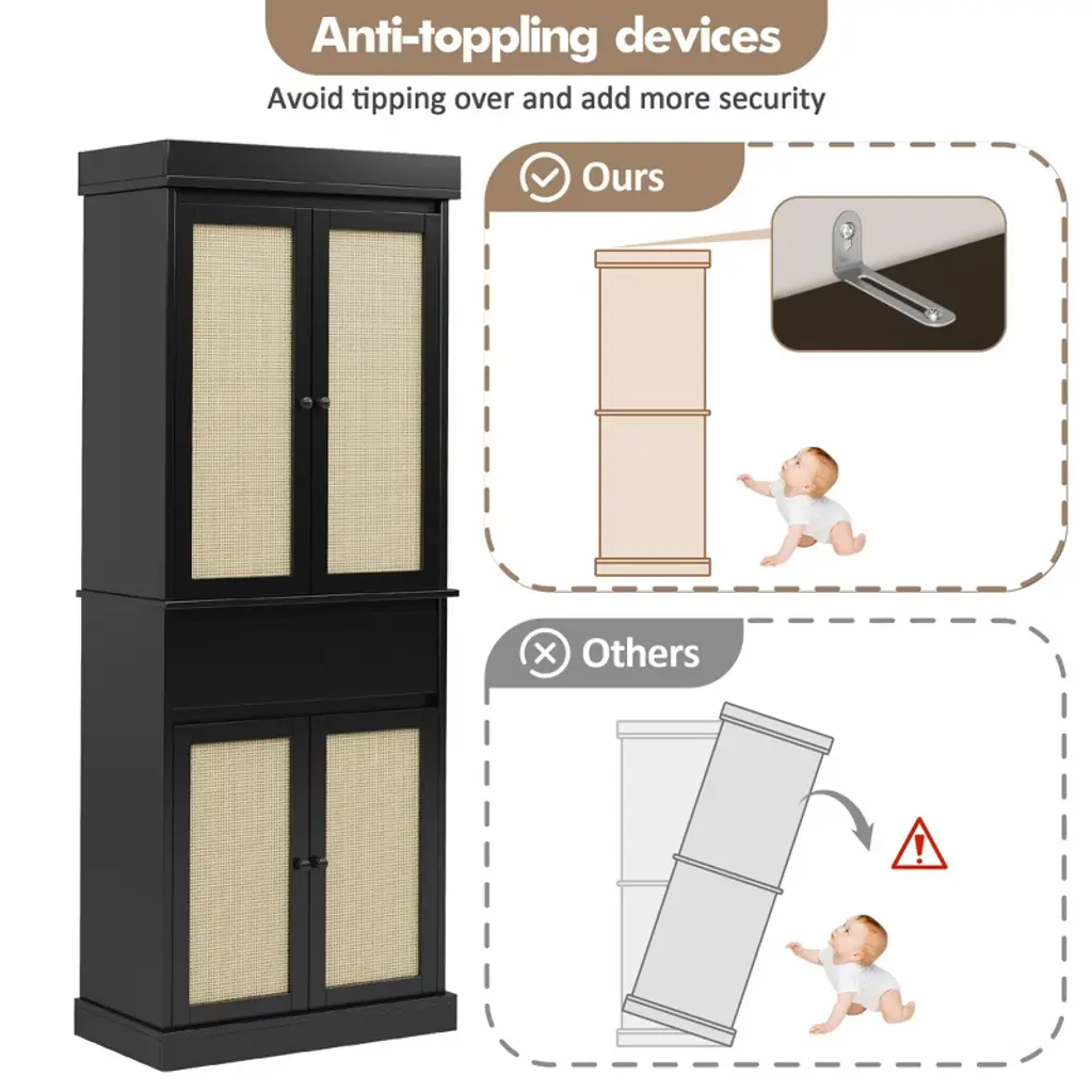 Pantry Cabinet with Rattan Doors, Tall Storage Cabinet with Drawer and Adjustable Shelves for Kitchen and Living RoomProduct Description:1. Modern Aesthetic with Natural TextureElevate your home's style with this tall cabinet that masterfully blends contemporary design with natural elements. The sleek black frame features smooth, clean lines complemented by stylish rattan door panels, creating a perfect balance of modern sophistication and organic texture. This versatile piece seamlessly integrates into various decor styles, from minimalist to bohemian, adding both functionality and visual appeal to any room.2. Customizable Three-Zone StorageExperience unparalleled organization with this cabinet's intelligent three-part storage system. It features two spacious rattan-door compartments with adjustable shelves, allowing you to customize the interior to fit items of various heights. The large, smooth-gliding central drawer provides easily accessible storage for smaller items, offering a perfect solution for keeping your space neat and clutter-free.3. Optimized Ergonomic DesignDesigned with user comfort in mind, this 69.1-inch tall cabinet is perfectly proportioned for easy access to all storage areas. The elevated base protects against floor moisture, extending the cabinet's lifespan, while high-quality hinges and silent drawer slides ensure smooth, quiet operation. Every detail is crafted to deliver both style and practical functionality.4. Heavy-Duty ConstructionBuilt from premium P2 grade engineered wood, this cabinet offers exceptional durability for long-term use. The robust construction features impressive weight capacity - the middle and bottom shelves can support up to 100 pounds each, while other shelves and the drawer hold up to 50 pounds. For added safety, an anti-tip wall anchor kit is included, making it family-friendly and secure.5. Hassle-Free Assembly ExperienceEnjoy peace of mind with a straightforward assembly process. The cabinet comes with clearly labeled parts, detailed instructions, and a spare parts pack for unexpected needs. Each unit undergoes thorough quality inspection before shipping, and dedicated customer support ensures your complete satisfaction with the product.Specifications:? Material: P2 Grade Engineered Wood, Rattan? Color: Black? Style: Modern with Natural Accents? Configuration: 2 Rattan Doors, 1 Drawer, Adjustable Shelves? Special Features: Anti-Tip Kit, Moisture-Resistant Base? Weight Capacity: Middle/Bottom Shelves 100 lbs, Other Shelves/Drawer 50 lbs? Mounting Type: Freestanding (Wall-Anchorable)? Overall Dimensions: 27.6"W x 13.8"D x 69.1"H