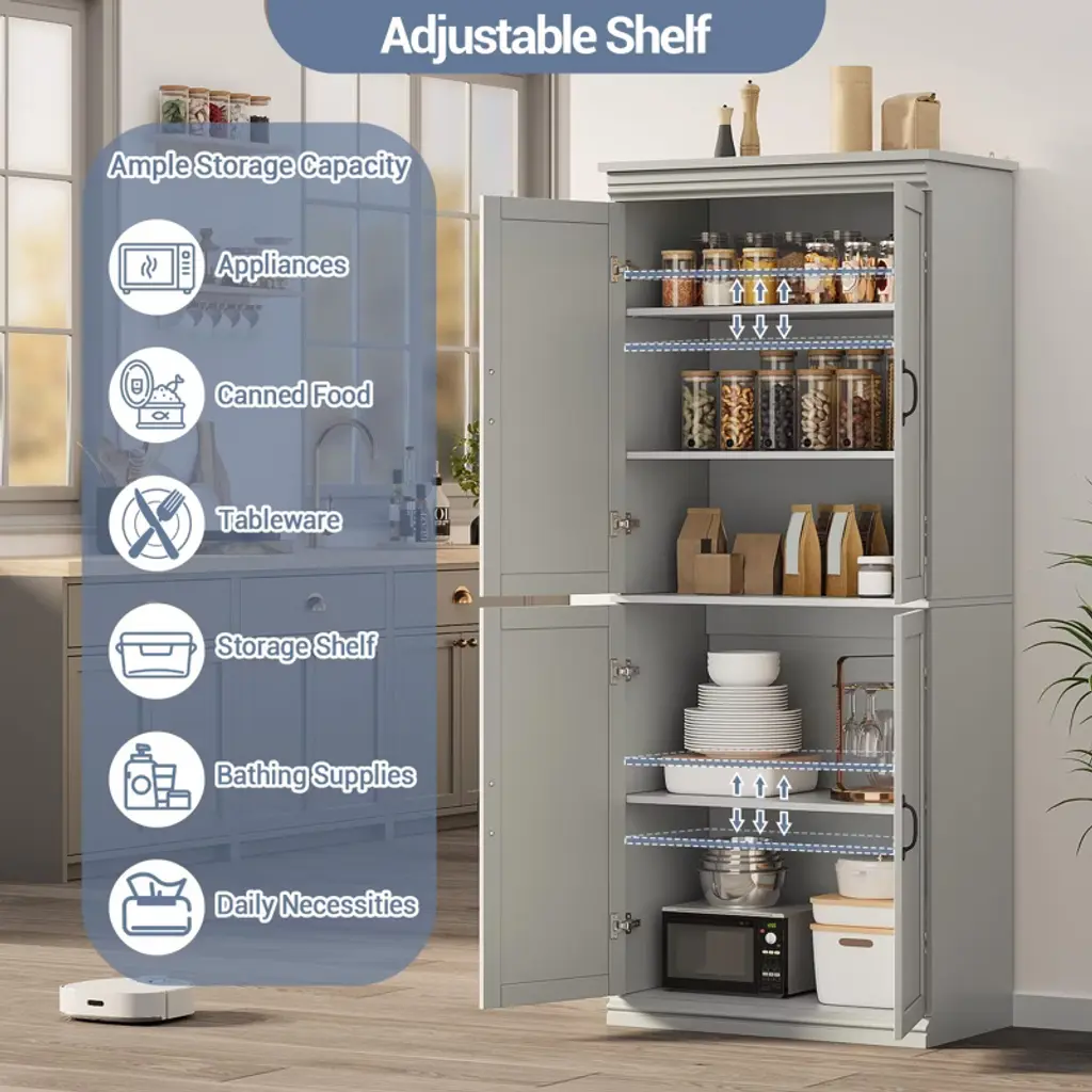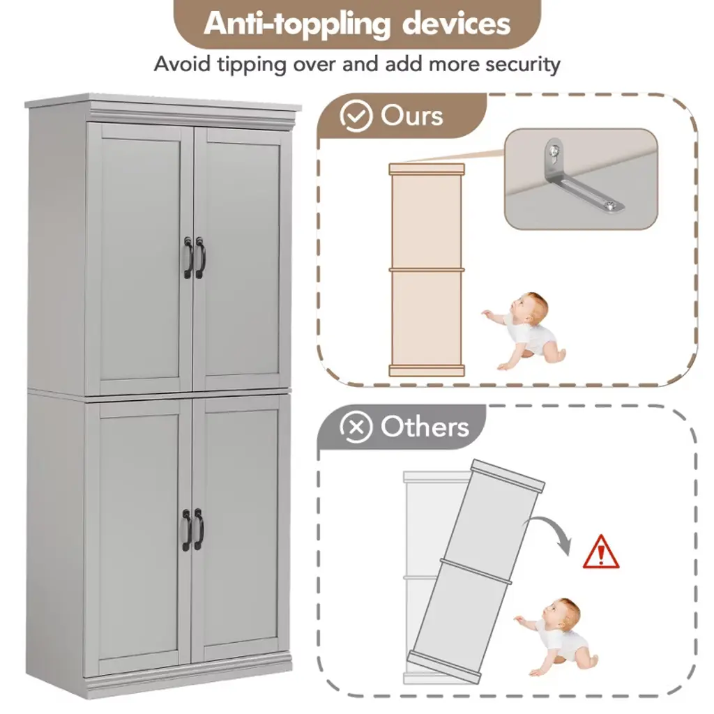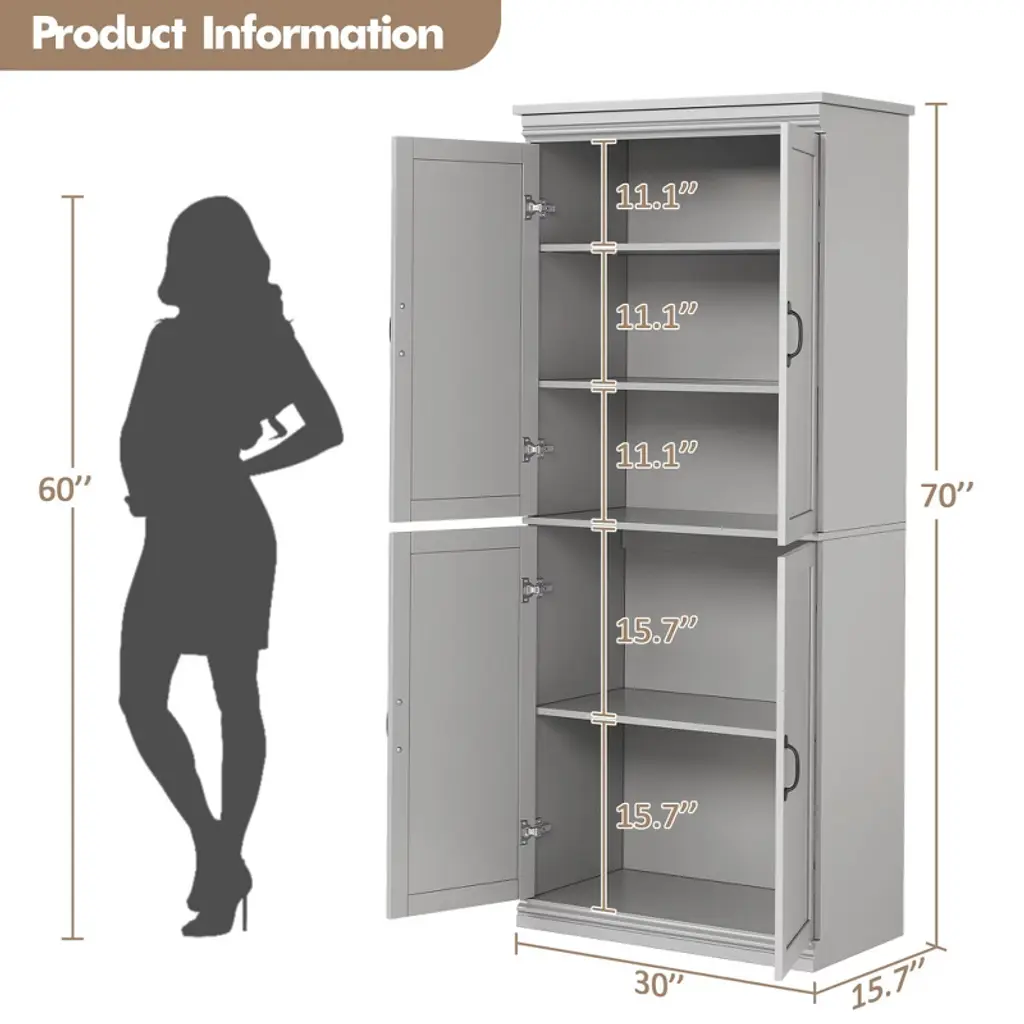Pantry Cabinet, 70" Tall Storage Cabinet - 2-Door Freestanding Cupboard with 3 Adjustable Shelves, Modern Kitchen & Bathroom OrganizerBrand: TROPOWMaterial: Engineered Wood (P2 MDF)Color: Neutral Wood ToneStyle: Modern CountryDimensions: 30"W x 14"D x 70"HWeight: 85 lbsShelves: 3 (Adjustable Height)Weight Capacity: Middle & Bottom Shelves: 100 lbs each Other Shelves: 50 lbs eachSpecial Features: Anti-Tip Kit, Oversized Metal HandlesAssembly Required: Yes (Includes Labeled Parts & Instructions) Product HighlightsSleek & Versatile Design 70" tall freestanding cabinet fits seamlessly in kitchens, bathrooms, or dining rooms Modern country style with clean lines and metallic handles Neutral wood finish complements any home decor Customizable Storage Space 3 adjustable shelves accommodate items of all sizes Two spacious compartments with smooth-operating doors Total dimensions: 30"W x 14"D ¨C ideal for tight spaces Heavy-Duty & Secure Premium P2 MDF construction ensures long-lasting durability 100 lb capacity on middle/bottom shelves (50 lbs on others) Includes anti-tip wall anchors for added safety Easy Assembly & Use? Pre-labeled parts for quick setup? Oversized coated handles for comfortable access? High-quality hinges for smooth door operationWhy Choose This Pantry Cabinet?? Maximizes Vertical Storage ¨C Perfect for small spaces? Adjustable Shelving ¨C Customize for your needs? Sturdy & Safe ¨C Supports heavy items securely? Multi-Room Use ¨C Works in kitchen, bathroom, or living areasIdeal For Storing: Pantry dry goods & kitchen supplies Bathroom toiletries & towels Home office or living room essentials