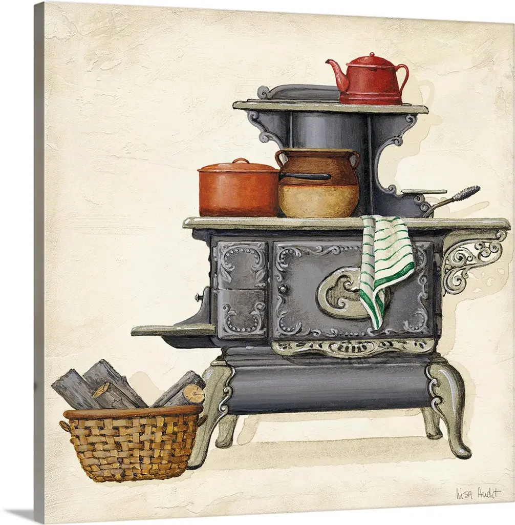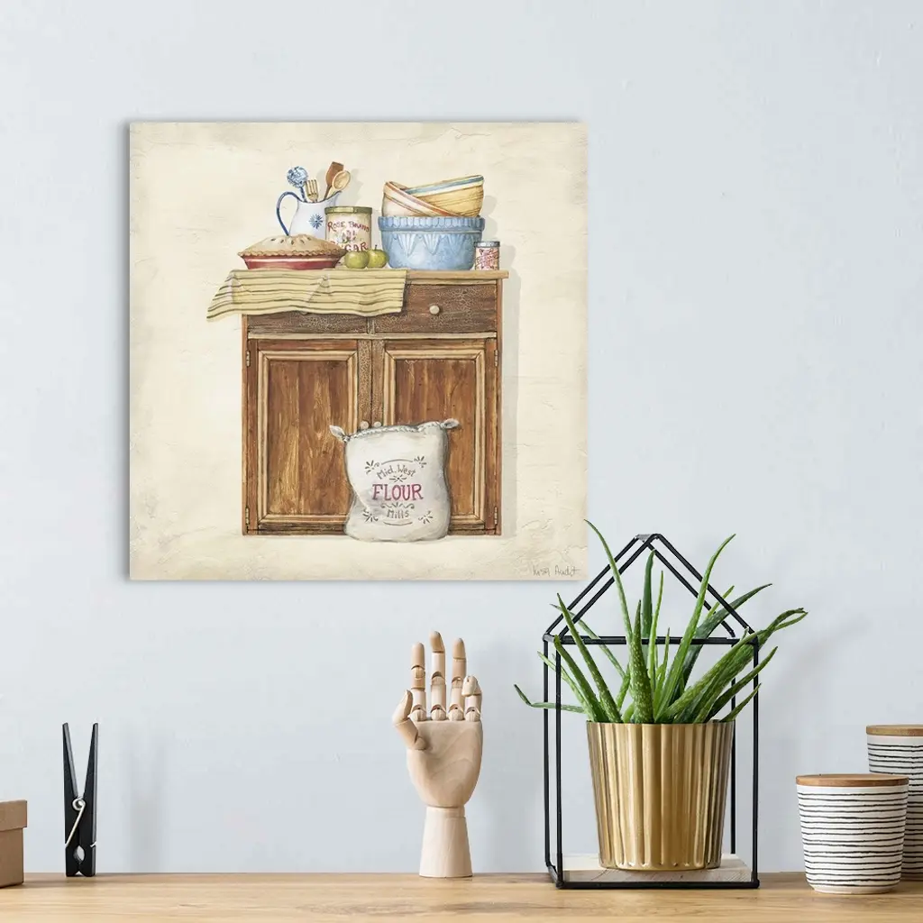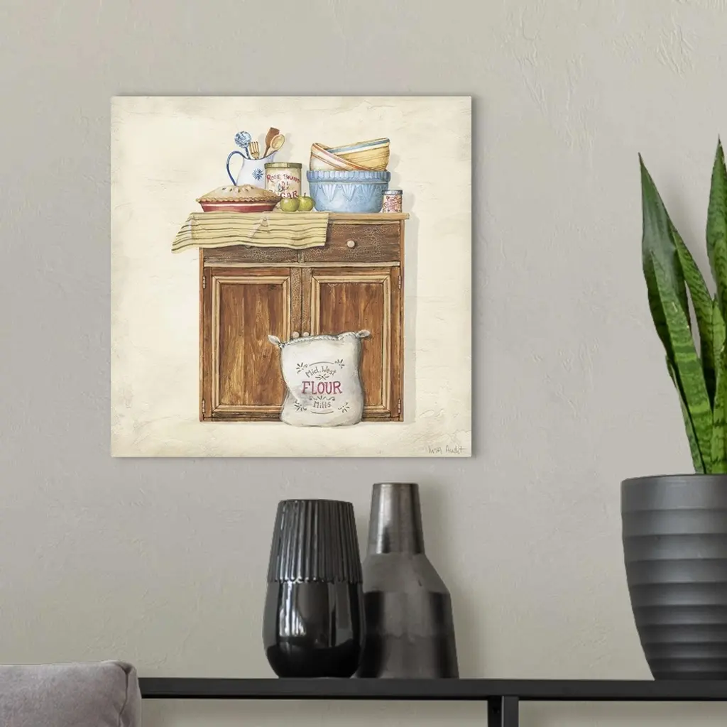 Sideboard cabinet with bowls, pitcher of utensils, and pie. Bag of flour on floor