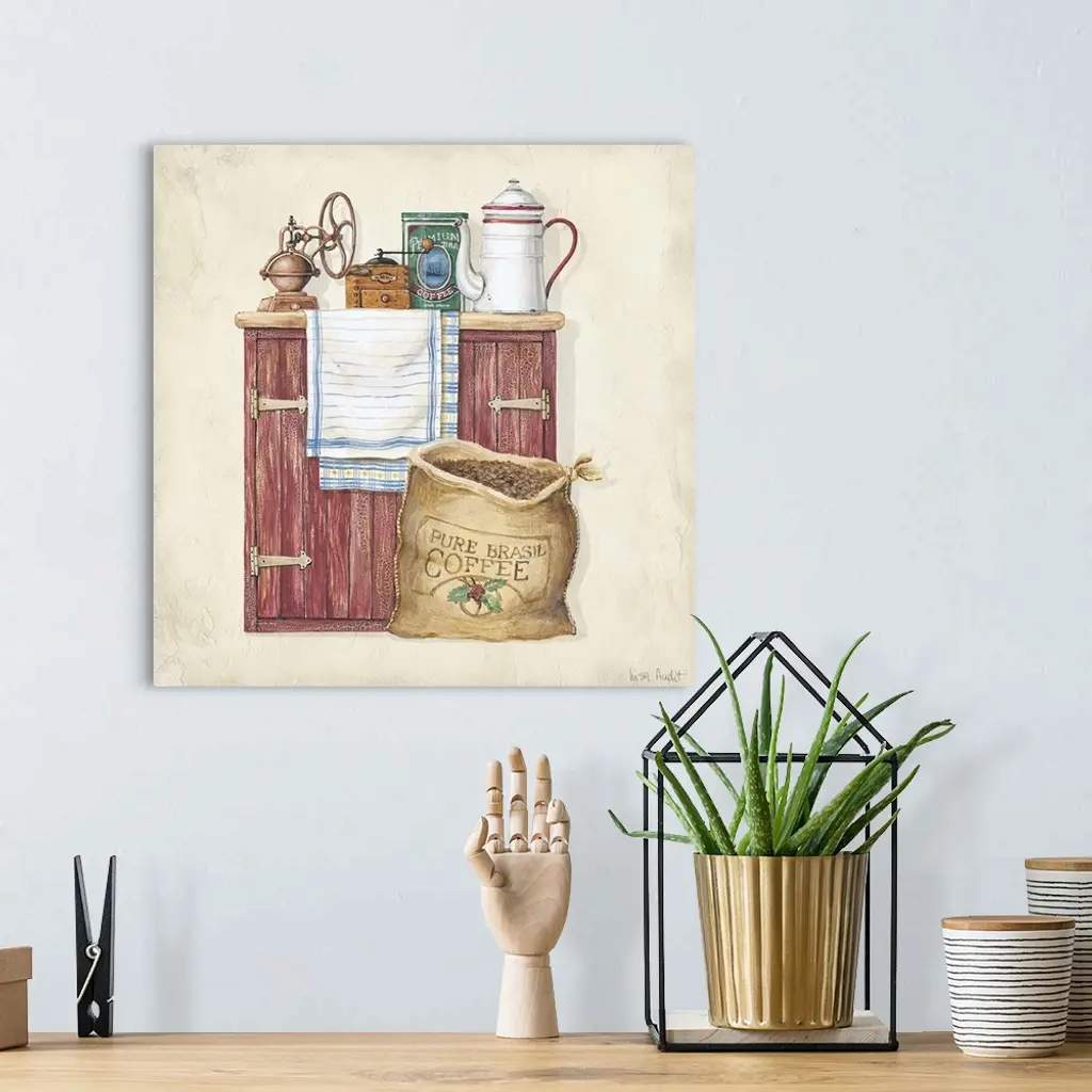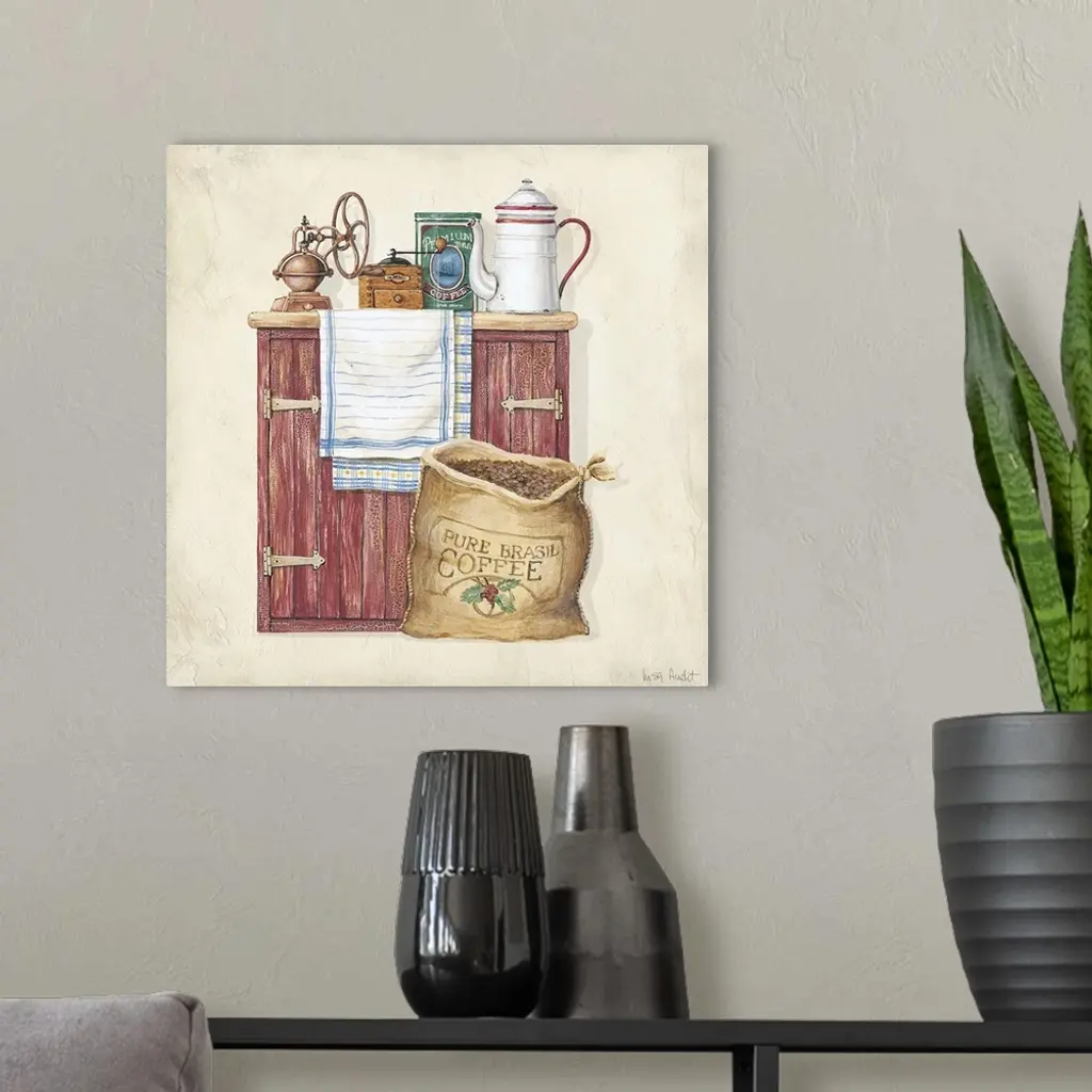 Sideboard cabinet with coffeepot, old-fashioned grinder, towel and tin of premium coffee. Sack of Pure Brasil Coffee on floor