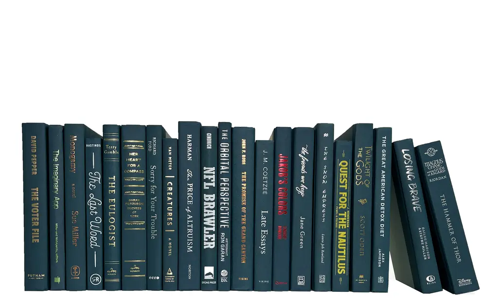 Transform your space with our Modern Blue Spruce: Color By The Foot. Order as many linear feet as you need to complete your project. Authentic modern hardback decorative books in crisp and unified shades of teal. All books are published 1980-present and include a variety of fiction and non-fiction titles. Each linear foot contains 10-12 books with an average height of 8.5-9.5". Exact titles will differ from those pictured.