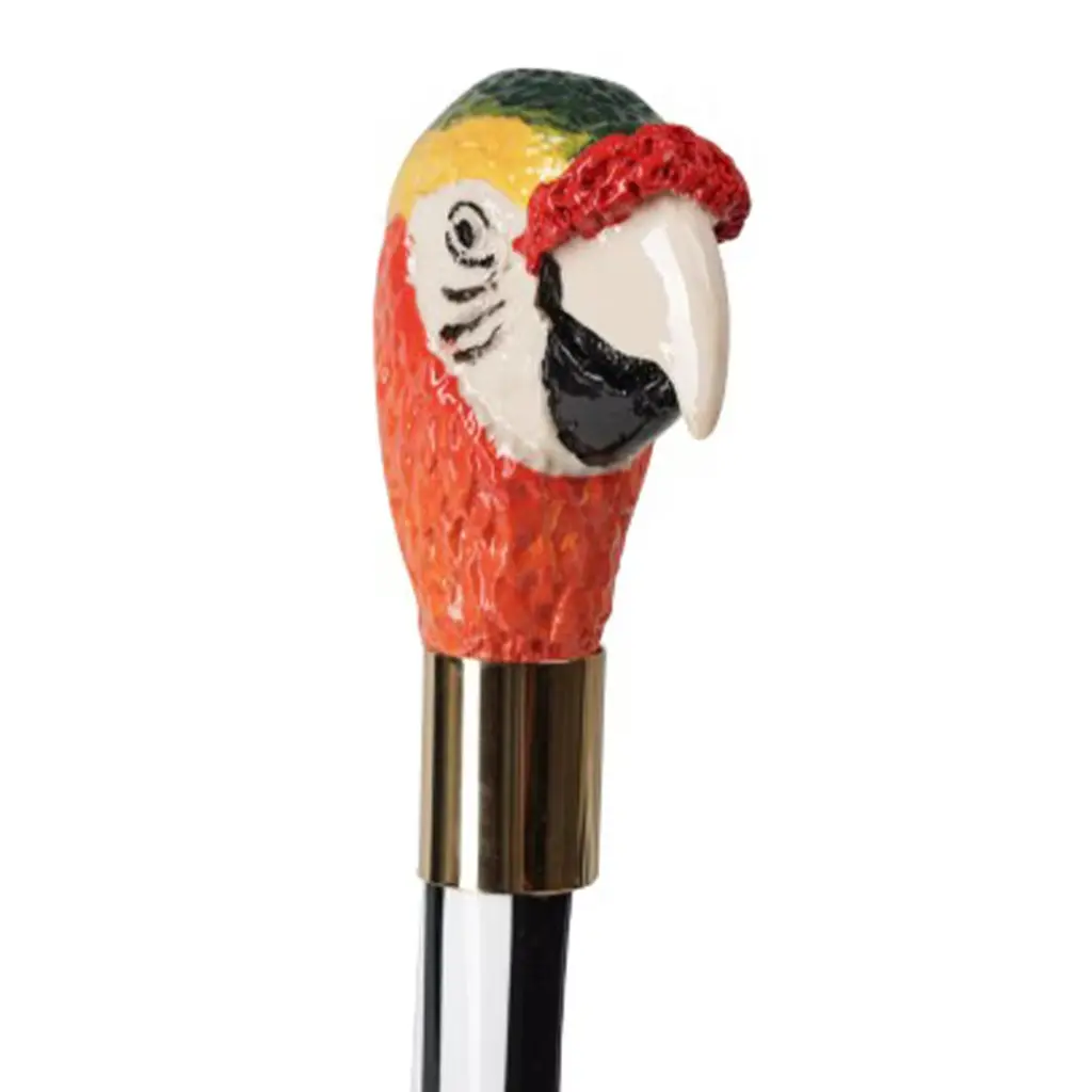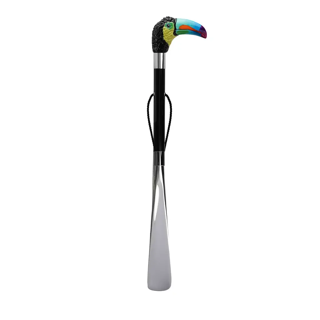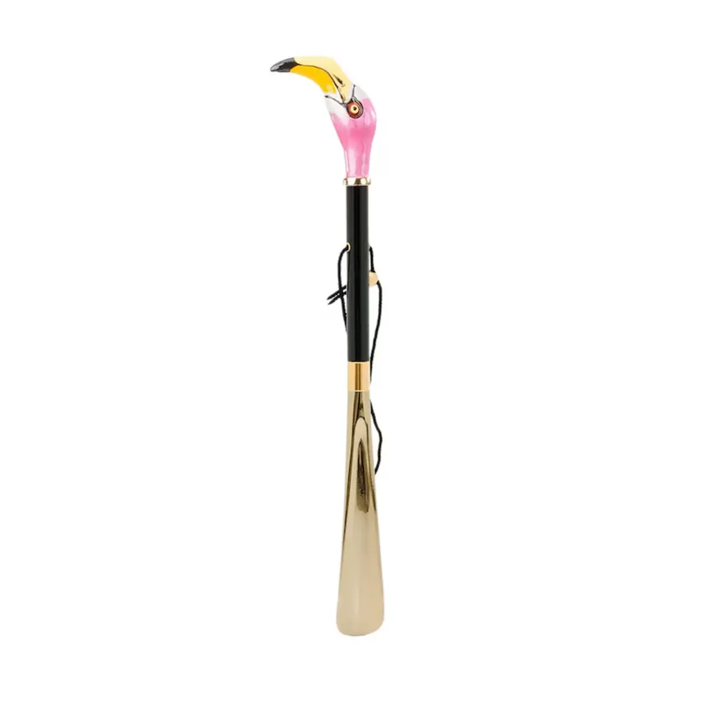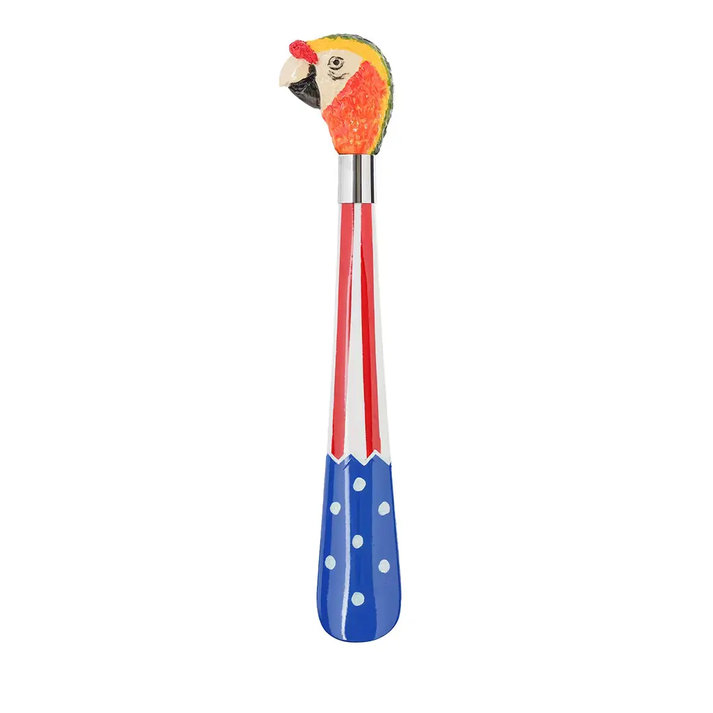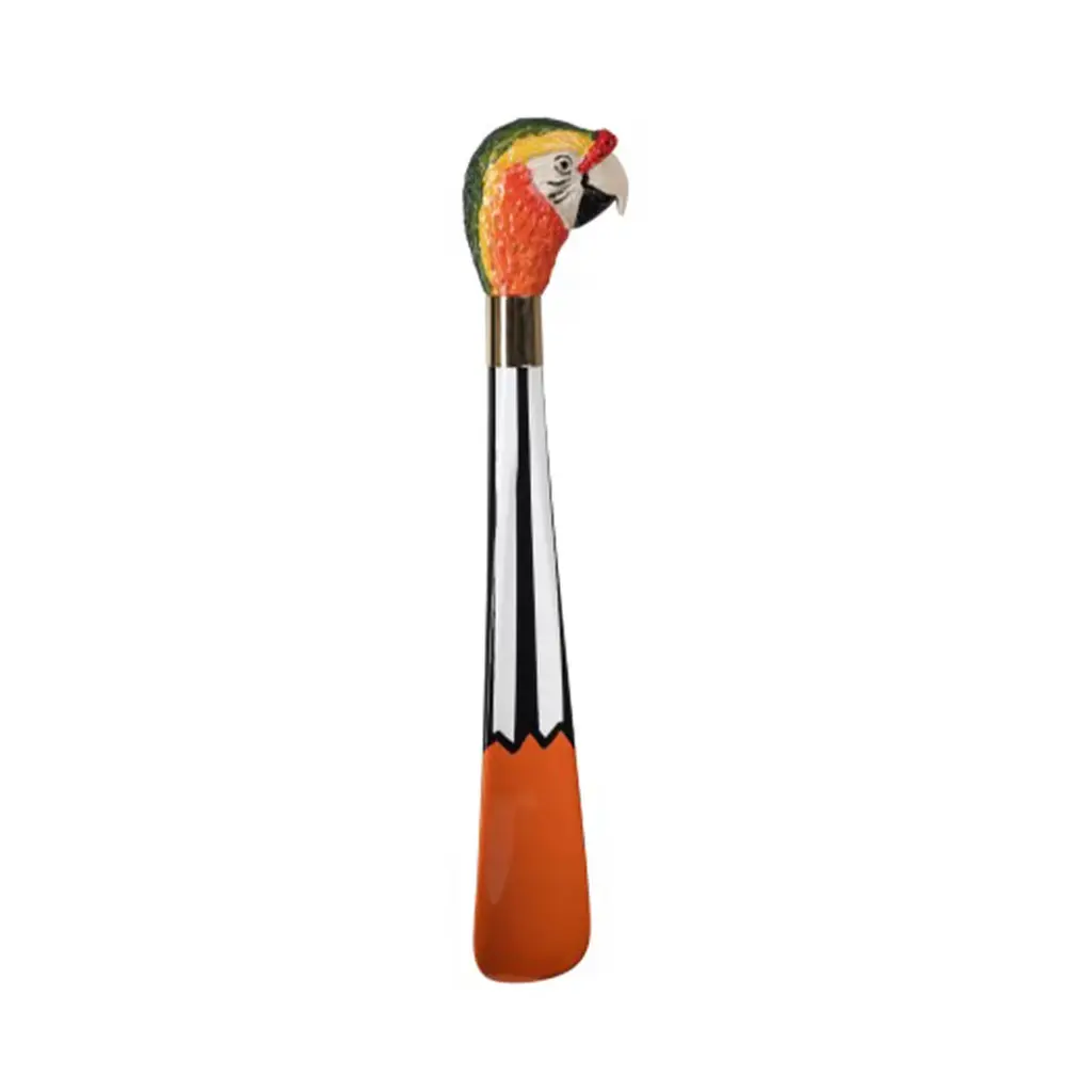 Painted by hand coupling vibrant enamels, the parrot head-shaped handle lending this shoehorn its eccentric character is obtained from fine marble powder. A polished silver-finished brass ring keeps the zoomorphic handle secured to the ABS paddle, which is also finely hand-decorated with a combination of black-and-white stripes and solid orange.