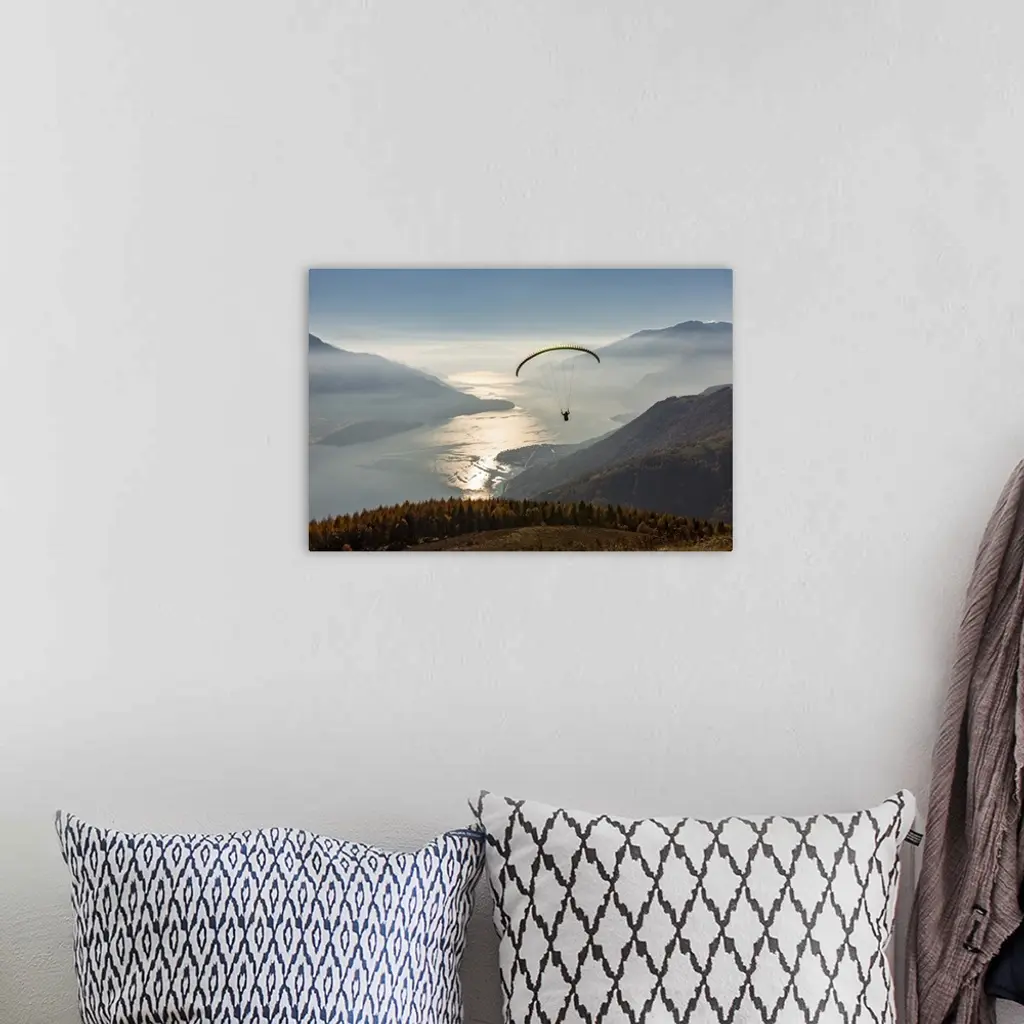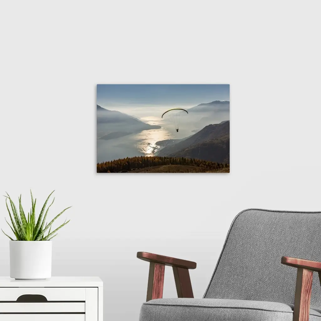 Paragliding over Lake Como and the surroundings mountains. Alto Lario, Como, Lombardy, Italy, Europe.