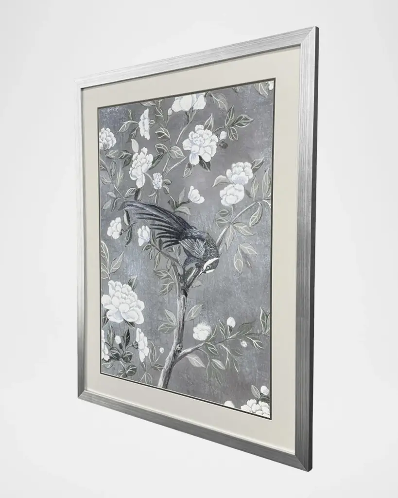 "Birds and Blooms" features a traditional floral motif with intertwining birds and florals. Matted behind glass glazing, it's mounted in a silver leaf block-profile wood frame for style and convenience. Handcrafted giclee on paper Overall, approx. 35"W x 2"D x 45"T D-rings attached to the back for hanging Hangs vertically Includes hanging hardware Wipe clean Weight, 19.0 lbs Made in USA Boxed weight, approximately 27.0 lbs Proposition 65 warning for California residents Shipping Direct from Vendor, usually ships within 30 business days. undefined