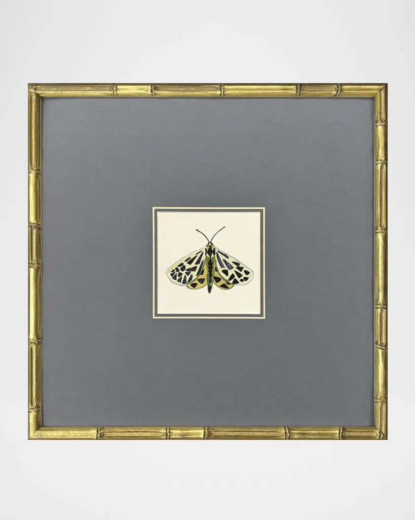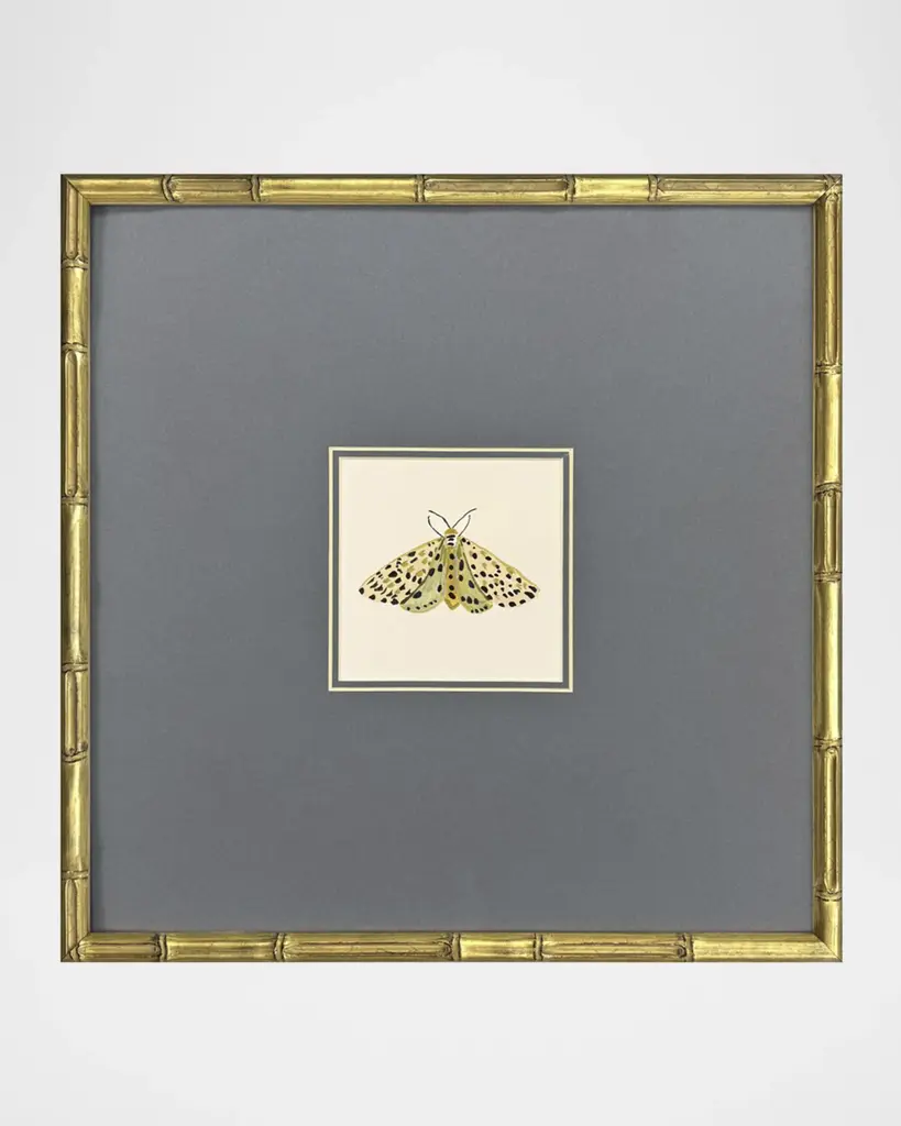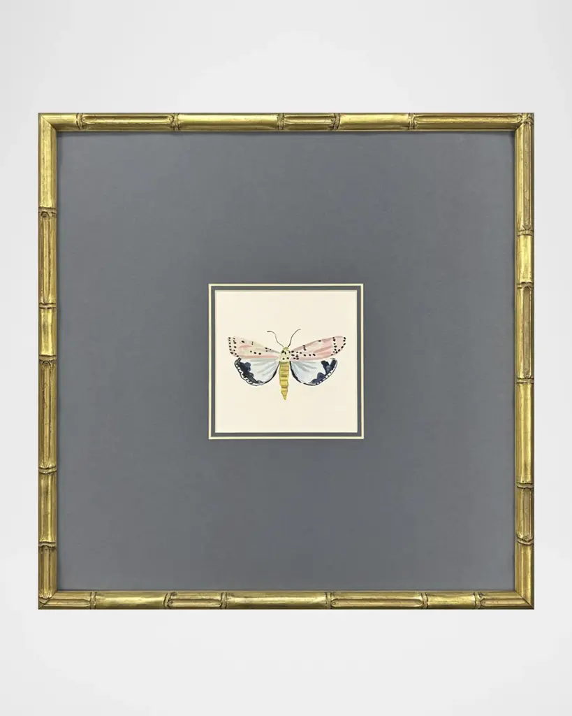 In the "Pastel Moths" series by Farida Zaman, delicate moth studies in soft pastel colors are matted behind glass glazing and mounted in a bamboo-embossed wood frame with an antiqued gold finish. Handcrafted giclees on paper Overall, approx. 17"Sq. x 2"D each Sawtooth hangers attached to the back Includes hanging hardware Wipe clean Weight, 9.0 lbs each Set of three Made in USA Boxed weight, approximately 12.0 lbs Proposition 65 warning for California residents Shipping Direct from Vendor, usually ships within 30 business days. undefined