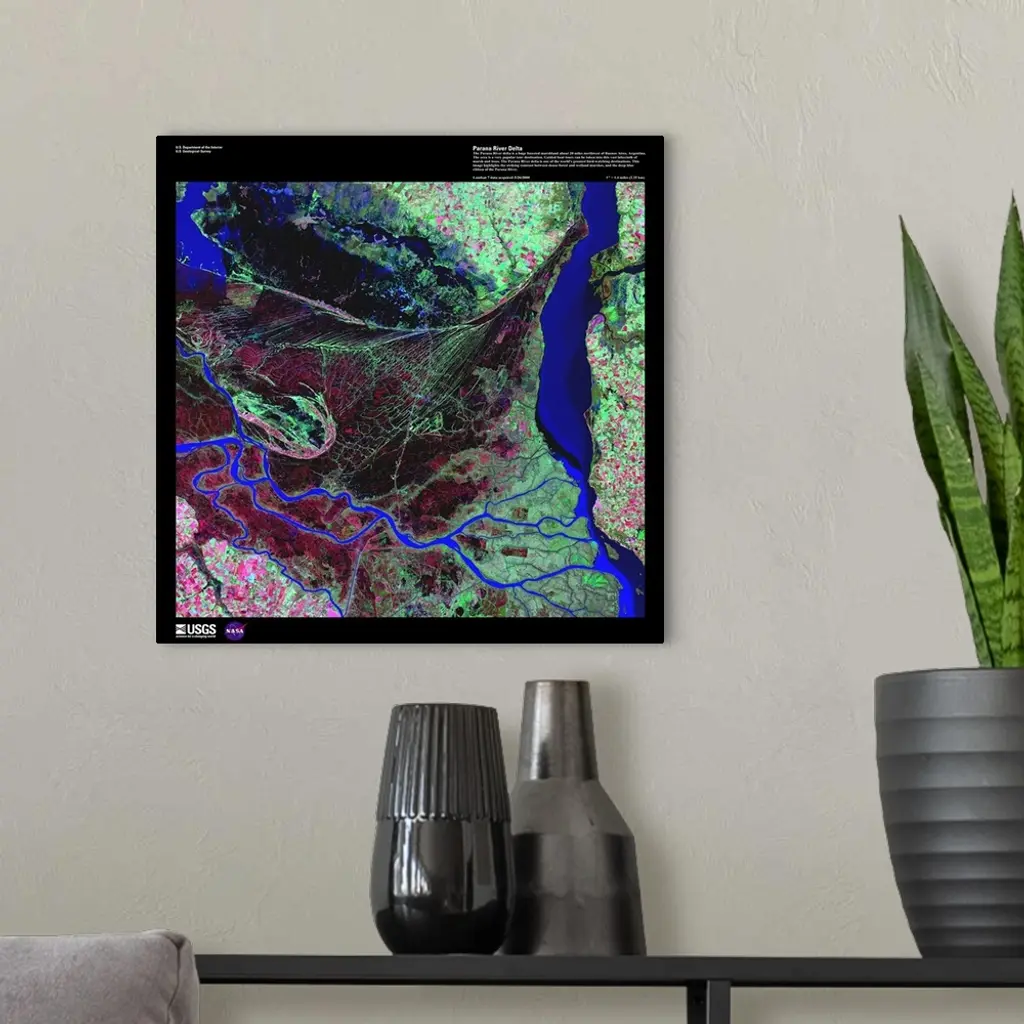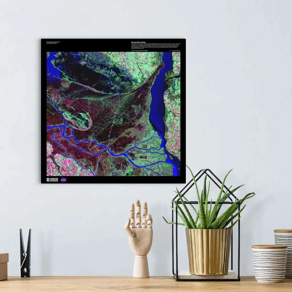 The Parana River delta is a huge forested marshland about 32km northeast of Buenos Aires, Argentina. The area is a very popular tour destination. Guided boat tours can be taken into this vast labyrinth of marsh and trees. The Parana River delta is one of the world's greatest bird-watching destinations. This image highlights the striking contrast between dense forest and wetland marshes, and the deep blue ribbon of the Parana River. May 1, 2000.