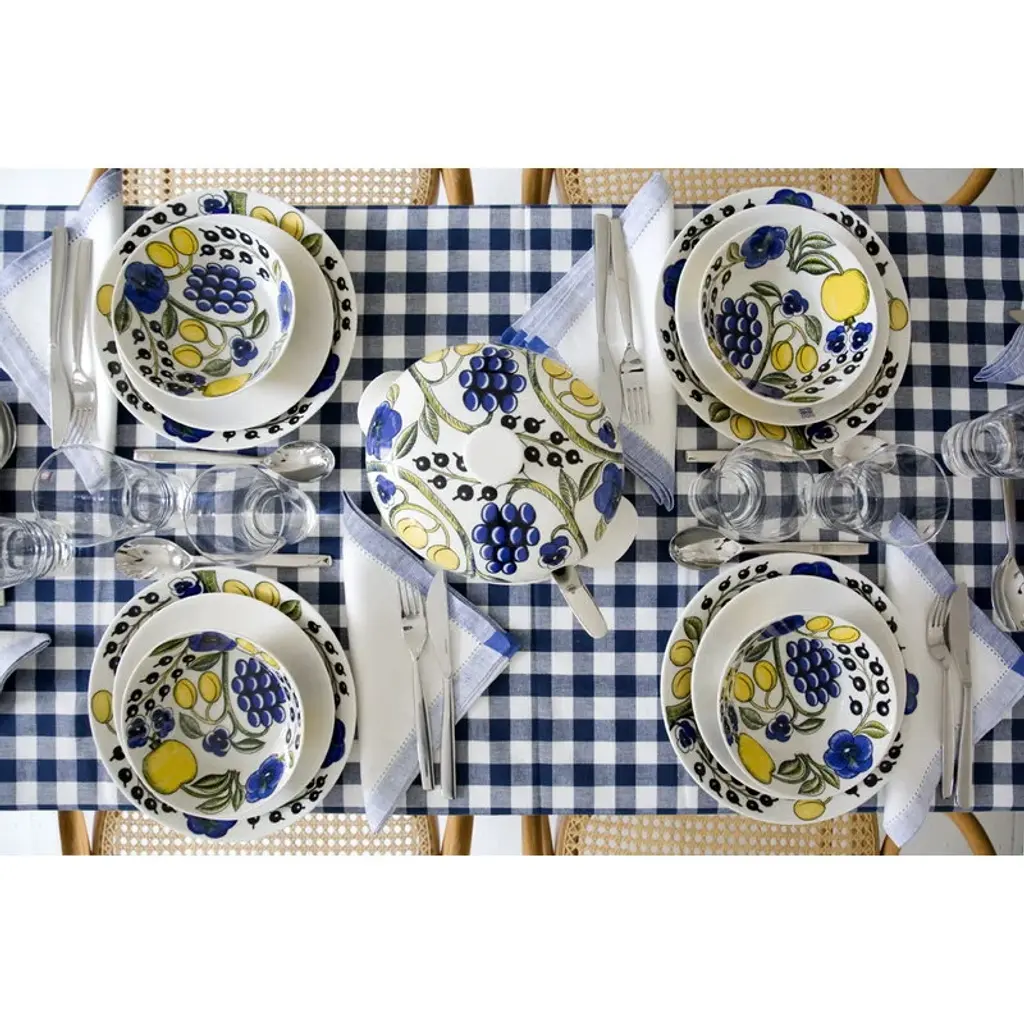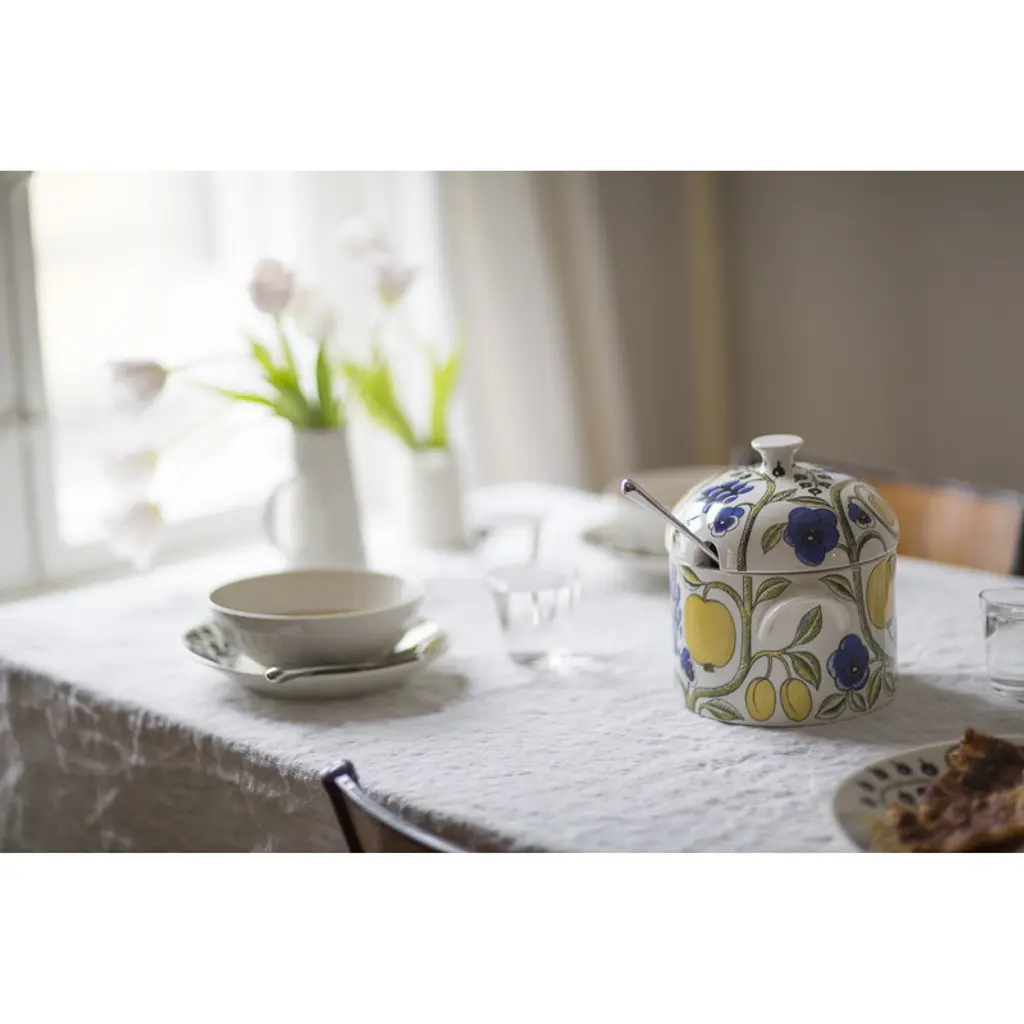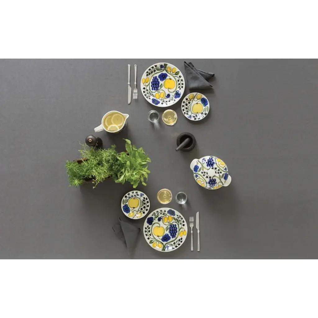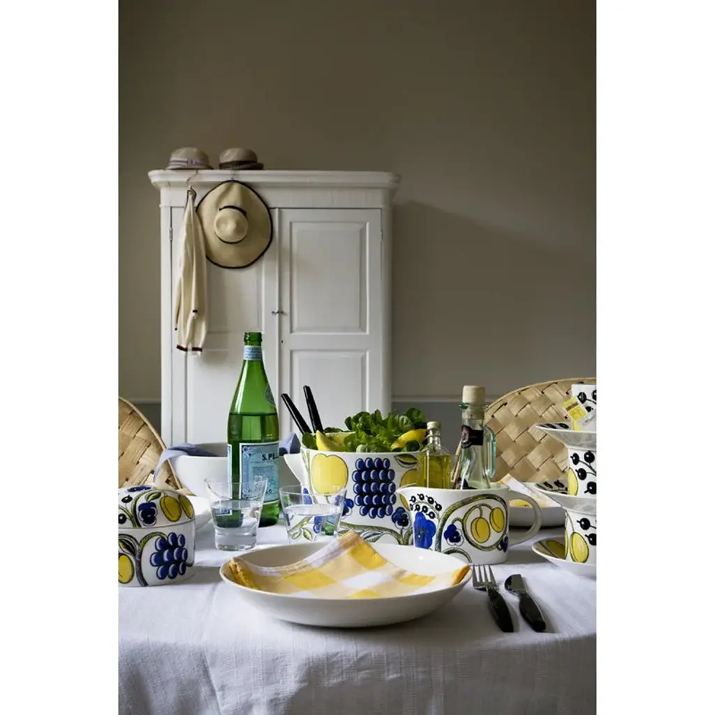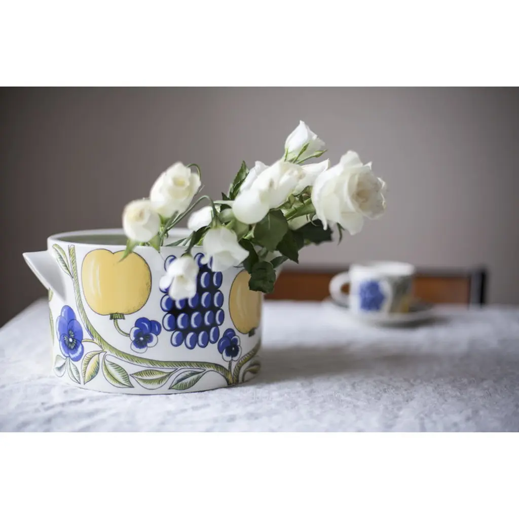 The Paratiisi tureen with lid by Arabia is adorned with Birger Kaipiainen's yellow-blue theme that gives a timeless, summery spirit for the abundant floral pattern. Arabia’s Paratiisi, Finnish for paradise, was designed by Birger Kaipiainen, the award-winning Finnish ceramic artist. The tableware features a simple and beautiful shape complemented by a rich design of fruits, violets and black currants. Created in 1969, Paratiisi is still one of Finland’s most beloved tableware classics.