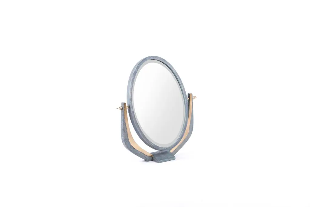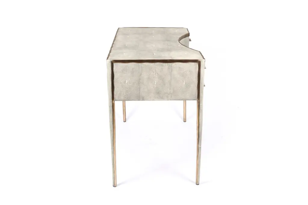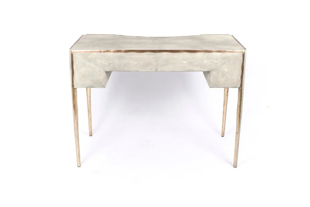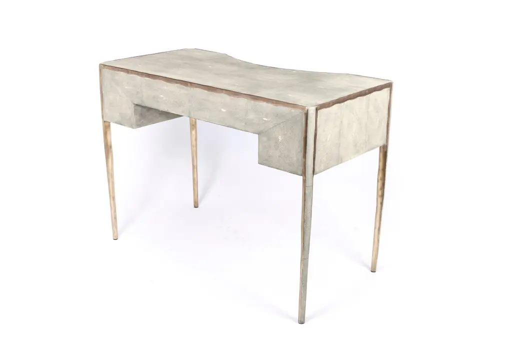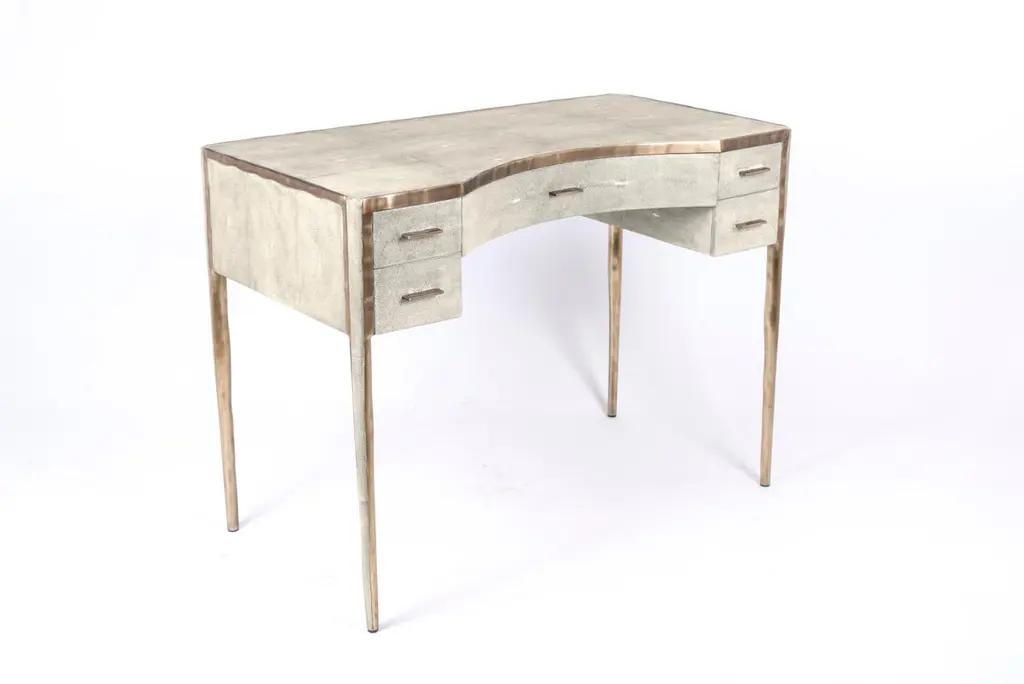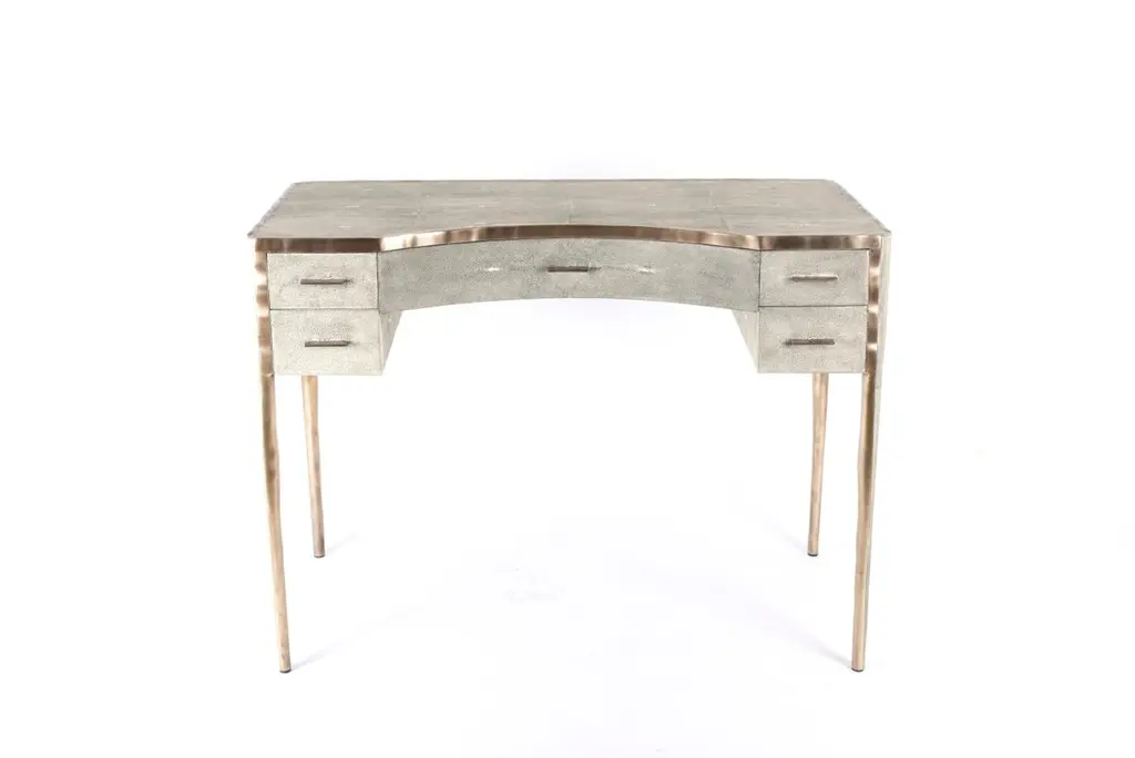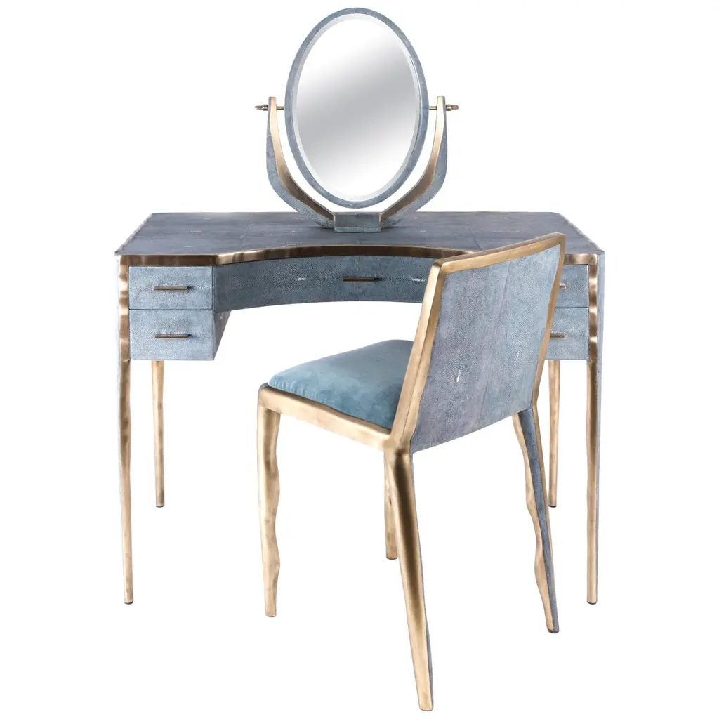 The Paris based label has distinguished themselves since their launch, with their iconic use of shagreen mixed with brass and other exotic materials. All furniture is handcrafted by skilled artisans, ultimately making each piece unique, designed in Paris and produced in the Philippines.The melting vanity table's simple but elegant design, makes for an adaptable elegant piece of furniture. The cream parchment inlaid surface is framed with an irregular surface bronze-patina brass that creates the "melting" effect against the parchment inlay. This desk includes 5 drawers total with a discreet thin metal handle. Mirror included, chair sold separately. Available in shagreen see images at end of slide, Custom color or sizing available on request.The finish of the parchment is authentic as it is hand-dyed The dimensions of this piece are 100 x 50 x 75 cm, 39" x 19.75" x 29.5"All R & Y Augousti pieces are handmade by artisans, ultimately making each piece unique.Wipe clean with soft dry cloth.Acclaimed design duo Ria & Yiouri Augousti have established themselves since the 1990s as pioneers of modern-vintage style through their luxurious Art Deco inspired collections.The Paris based label has distinguished themselves since their launch, with their iconic use of shagreen mixed with brass and other exotic materials. All furniture is handcrafted by skilled artisans, ultimately making each piece unique. All shagreen-covered items should be kept out of direct sunlight, color variants may occur on the stingray and other exotic finishes, but this showcases the Parisian label's commitment to creating authentic luxurious products using natural components.