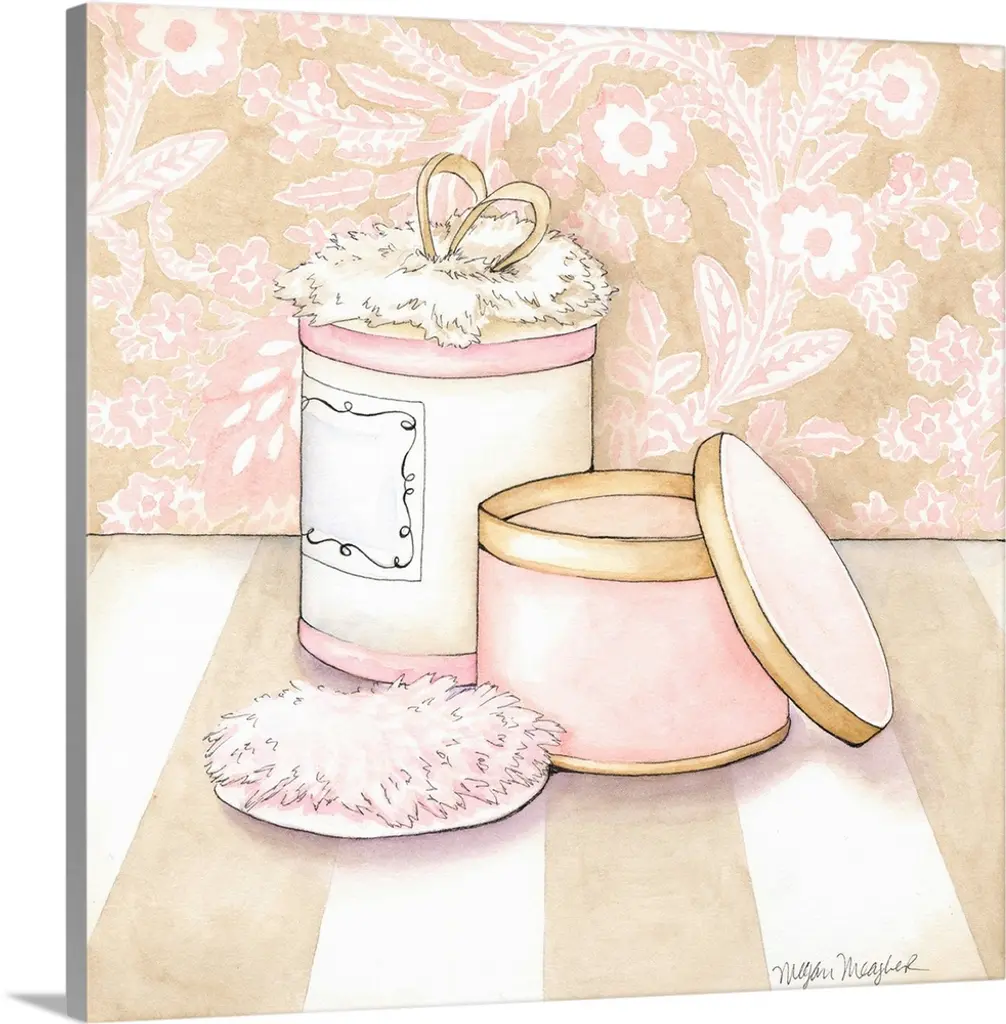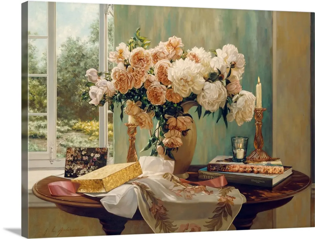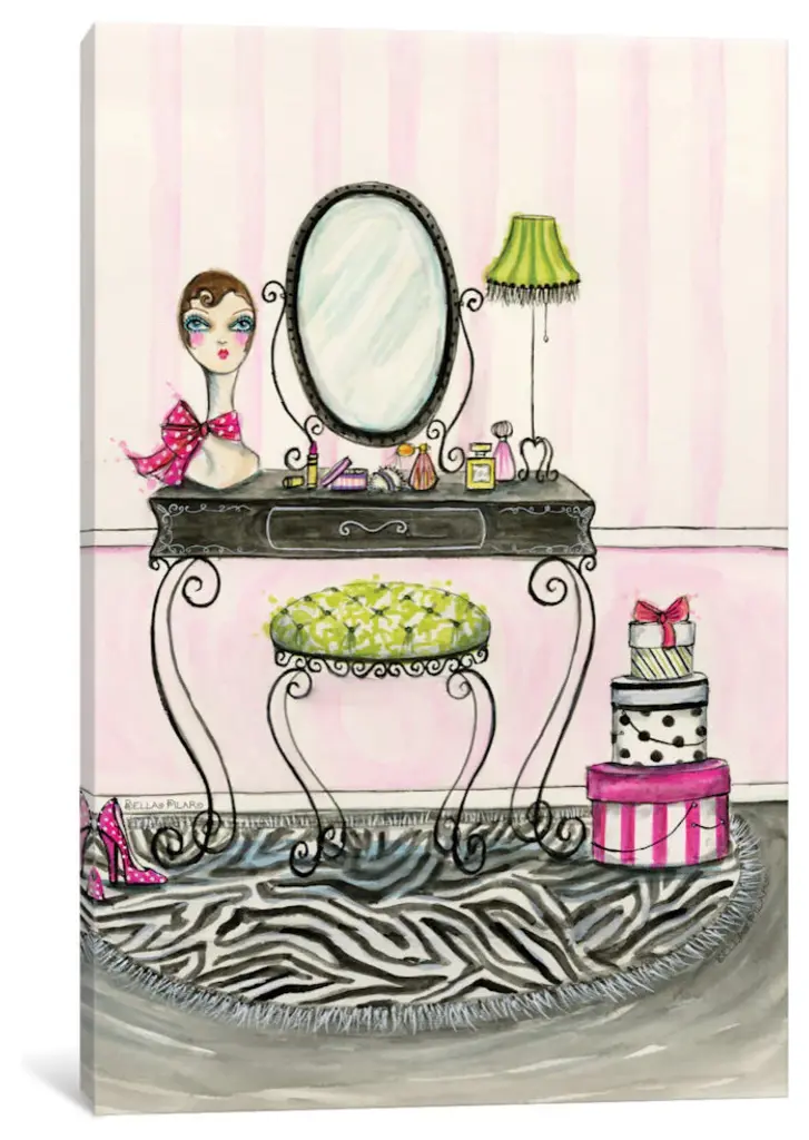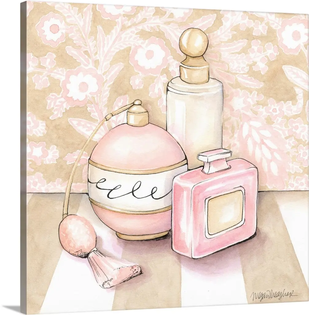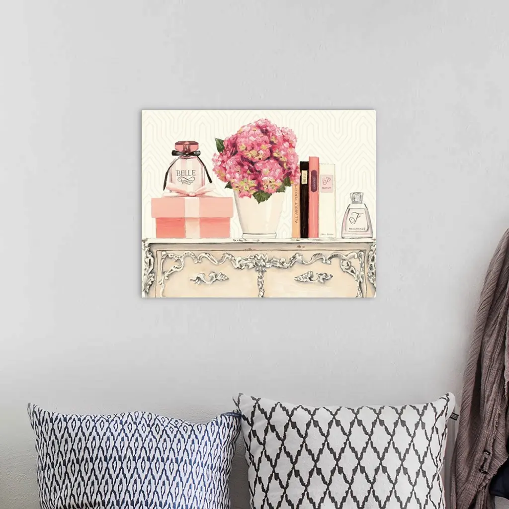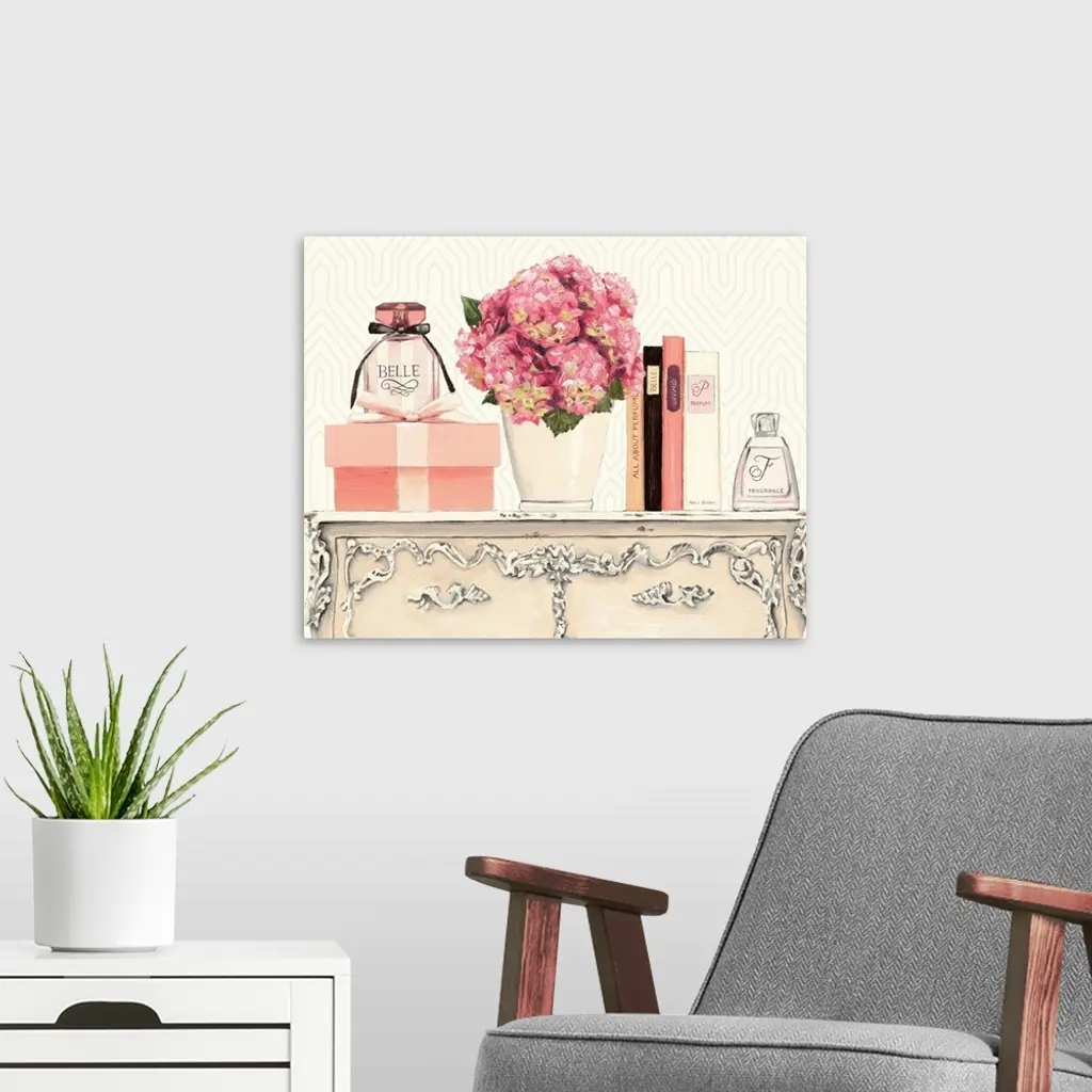 Contemporary still life of pink flowers and perfume bottles sitting on a dresser.