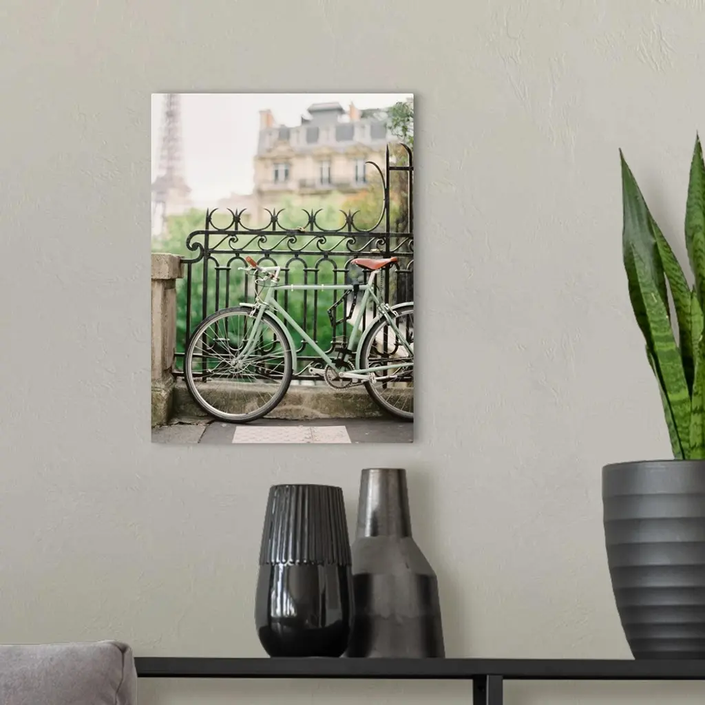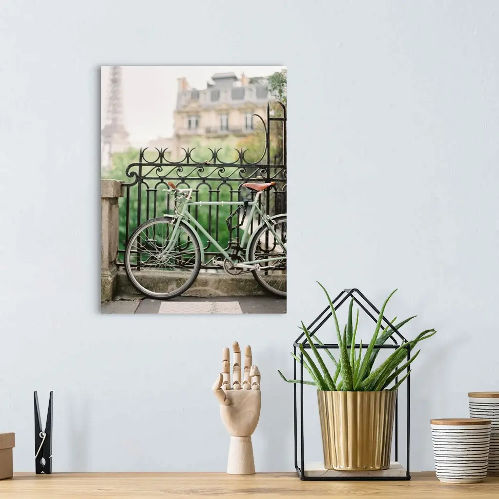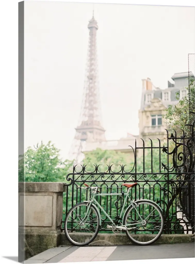 Photograph of a bicycle leaning against an ornate metal railing with the Eiffel tower in the distance.