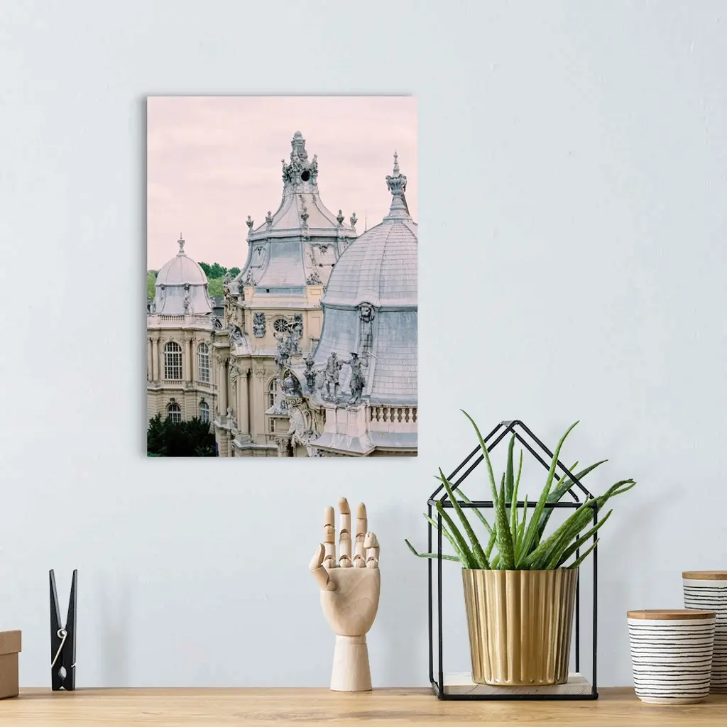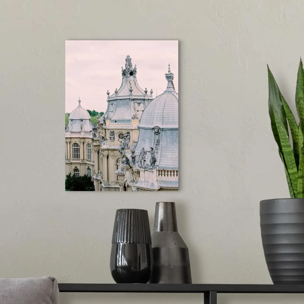 A photograph showing the highly detailed architecture of a domed roof in Paris, France.