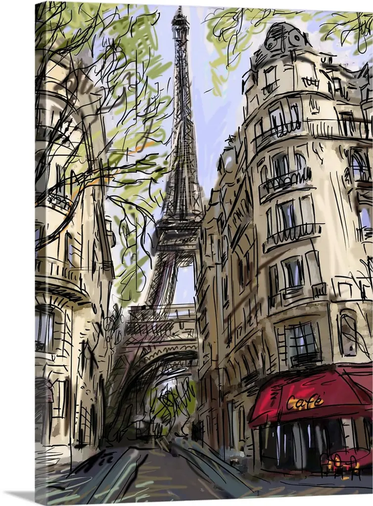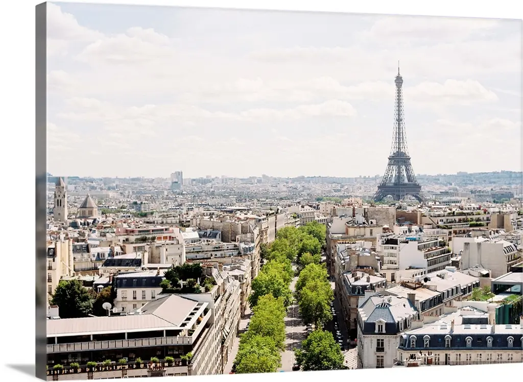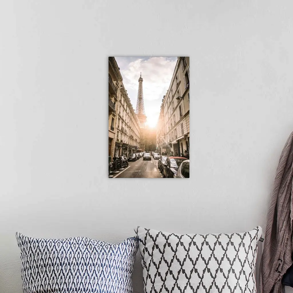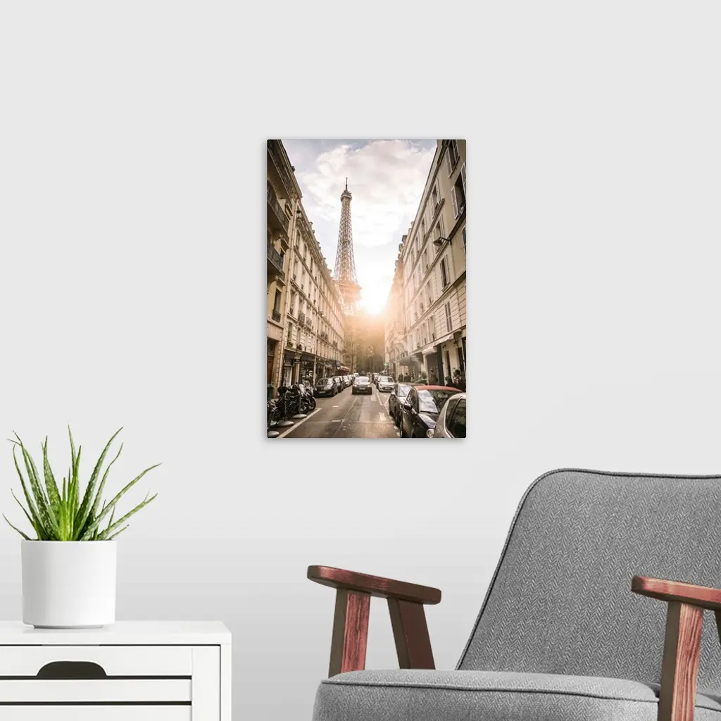 Photograph of a streetscape in Paris with the sun beaming through the Eiffel Tower in the background.