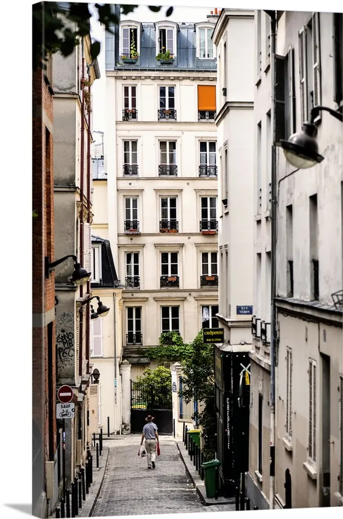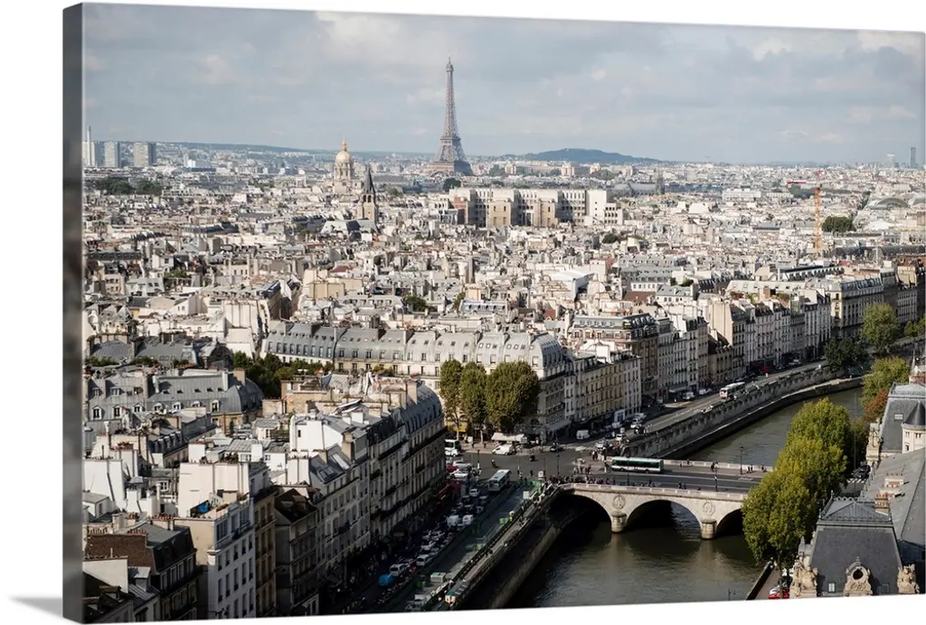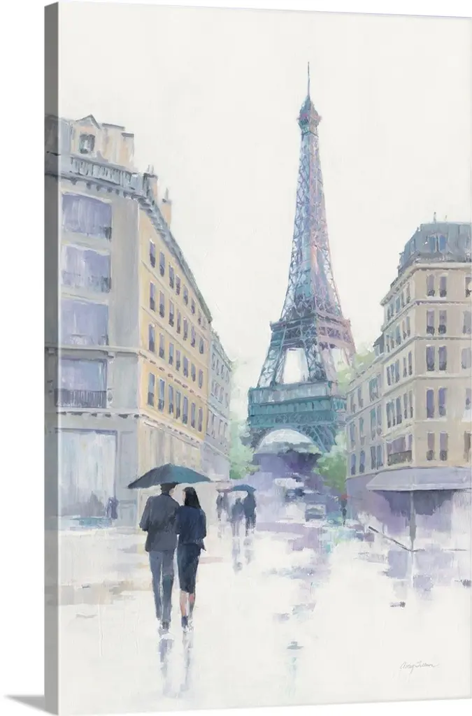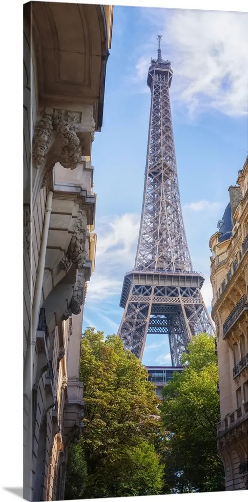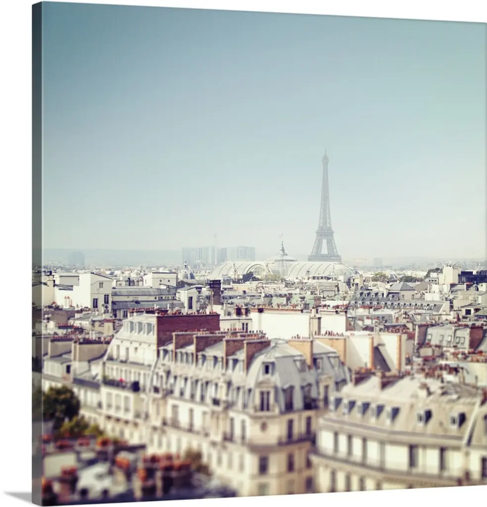 Photograph of a streetscape in Paris with the sun beaming through the Eiffel Tower in the background.