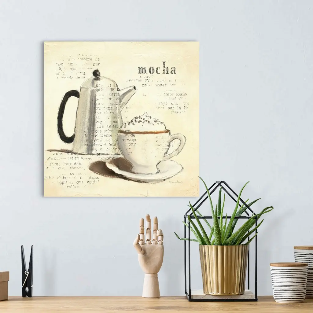 Square, large home art docor of cup of gourmet coffee with whipped cream on top, next to a metal pot. The word ""mocha: in print at the top with various faded newsprint over the image on a parchment background.