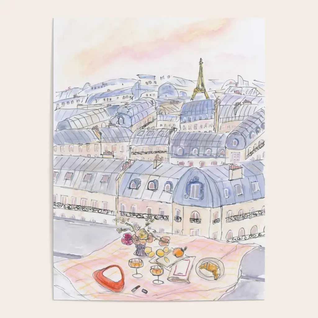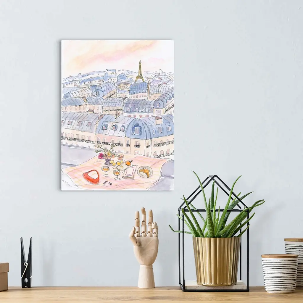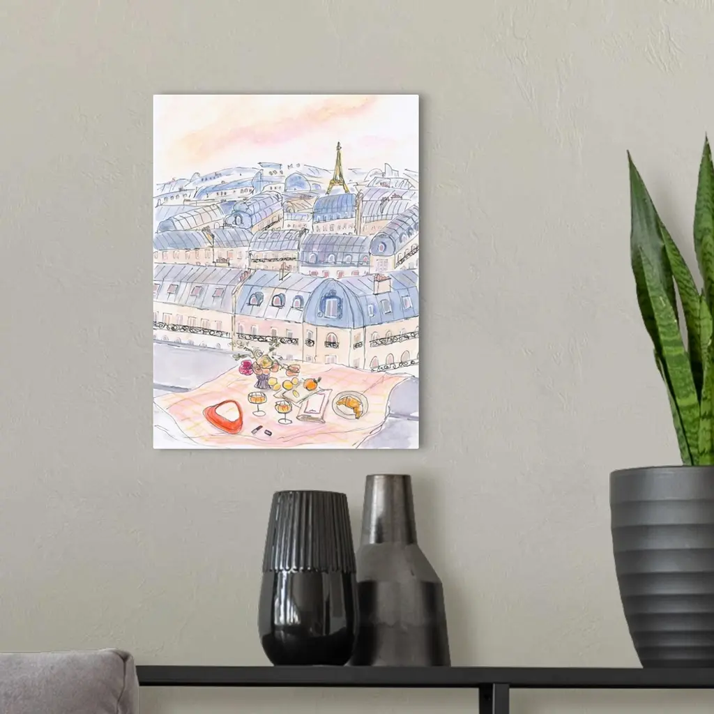 Parisian Rooftop Picnic With Eiffel Tower Views wall art for home and office decor. Discover canvas art prints, photos, mural, big canvas art and framed wall art in GreatBigCanvas.com's varied collections.