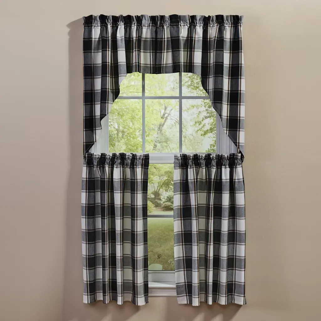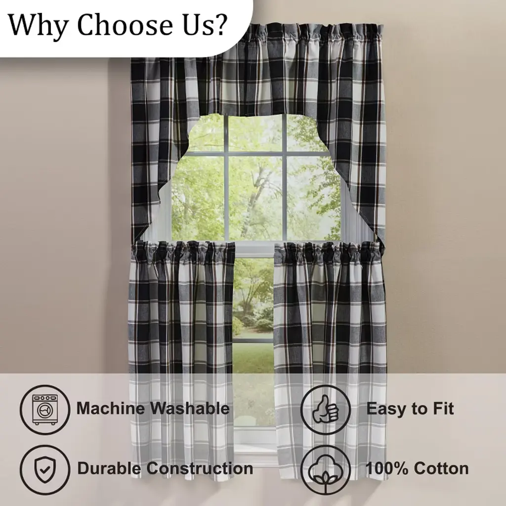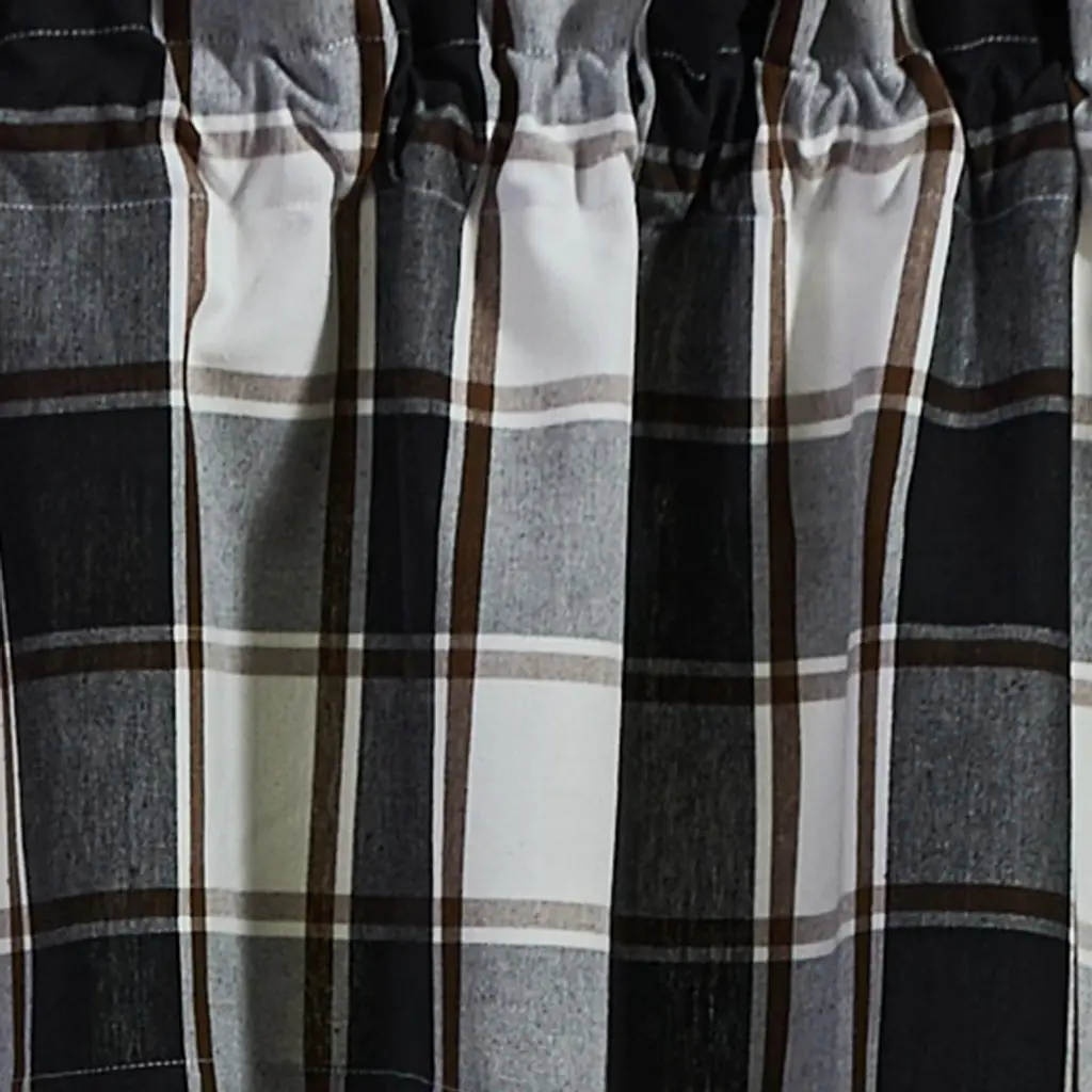 Blending classic with cozy! This pair of patterned swag valance curtains have a traditional plaid design that elegantly incorporates a country color palette in rustic black, brown, and white hues. Features unlined fabric and natural ruffling with delicately draped sides to offer a timeless look without having to redecorate an entire room. Can be used by itself or paired with your favorite tier or curtain panel for a unique and dynamic wall display. This window treatment can be used time and time again in your favorite farmhouse, country, fall, lodge, cabin, and primitive room decor.