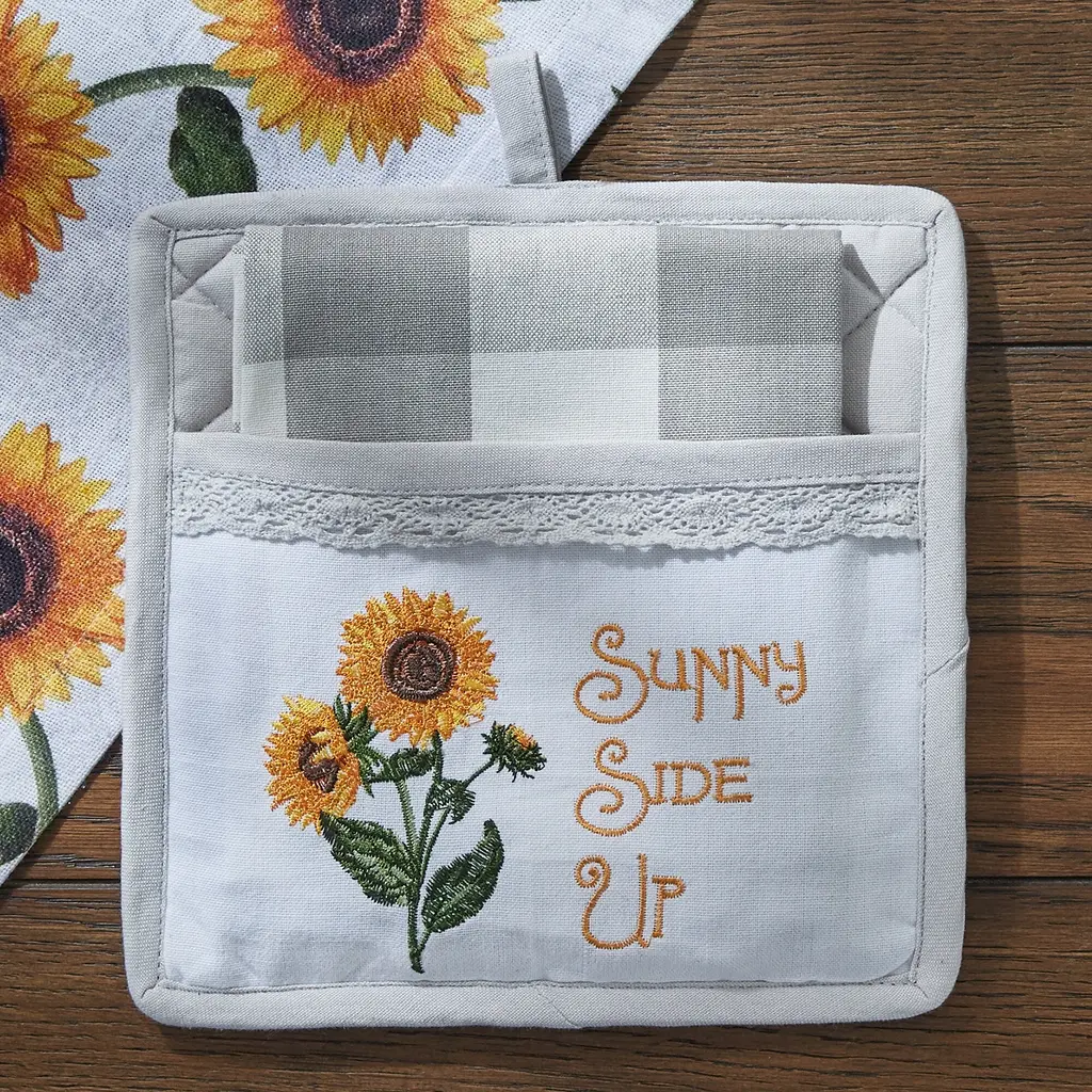 Maintain your farmhouse decor with this adorable pocket potholder set. Its simplicity, embroidered sunflowers, and subtle hues will allow it to blend with a variety of decor styles. This kitchen essential bundle includes two potholders and two plaid dishtowels that will get softer and more absorbent with each use. It will be the ideal kitchen decor for each season.