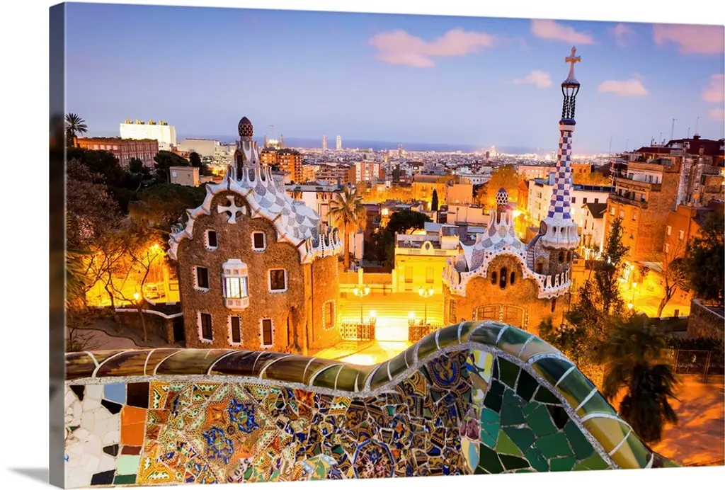 Park Guell with city skyline behind at dusk, Barcelona, Catalonia, Spain.