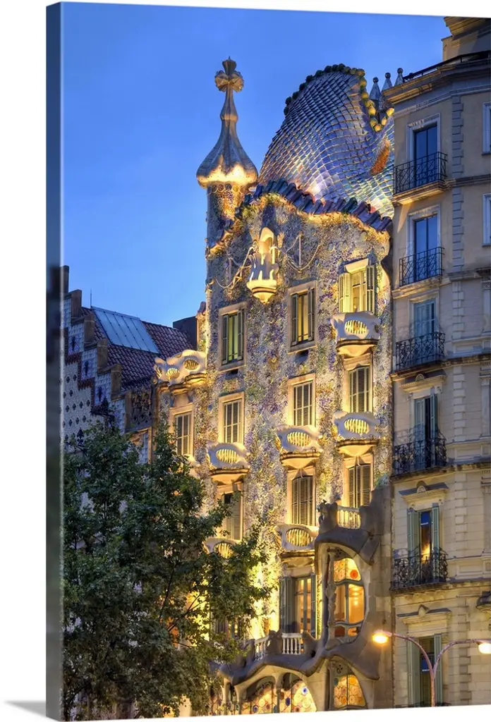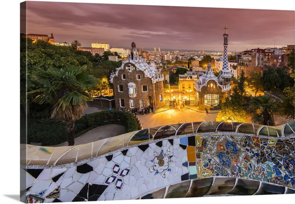 Park Guell With City Skyline Behind At Dusk, Barcelona, Catalonia, Spain