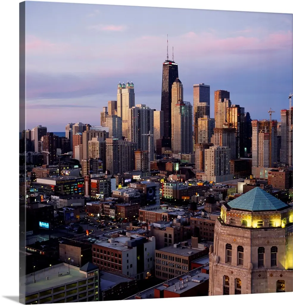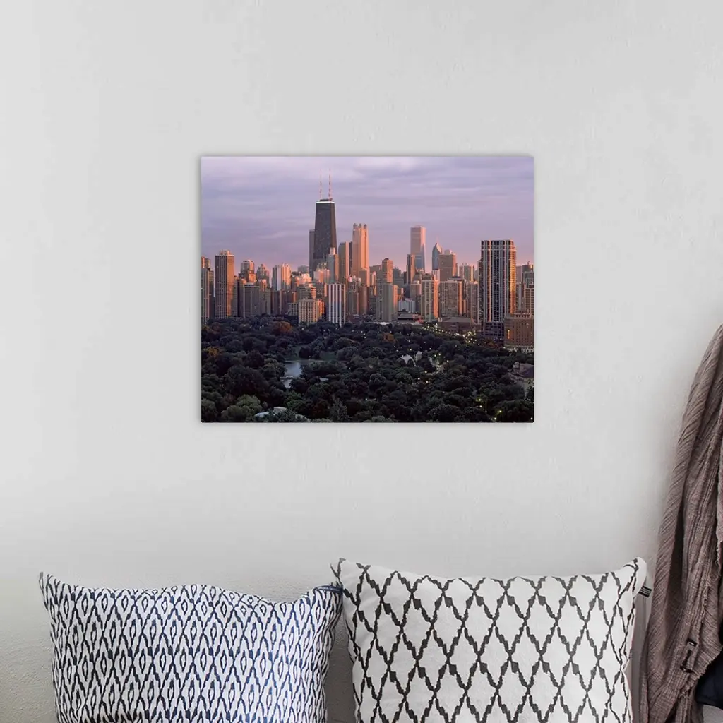 This twilight photograph of the downtown shows the interior of a city park and many major city skyscrapers beyond on horizontal cityscape.