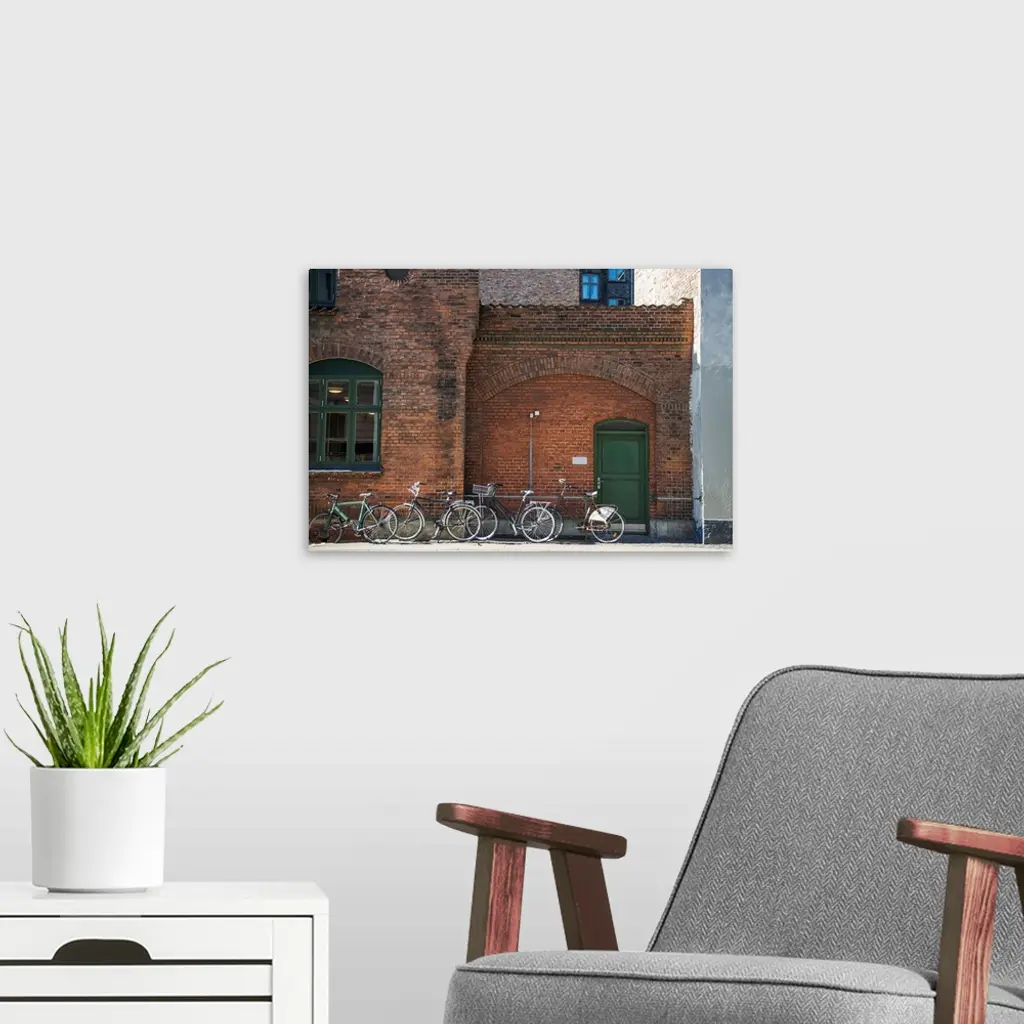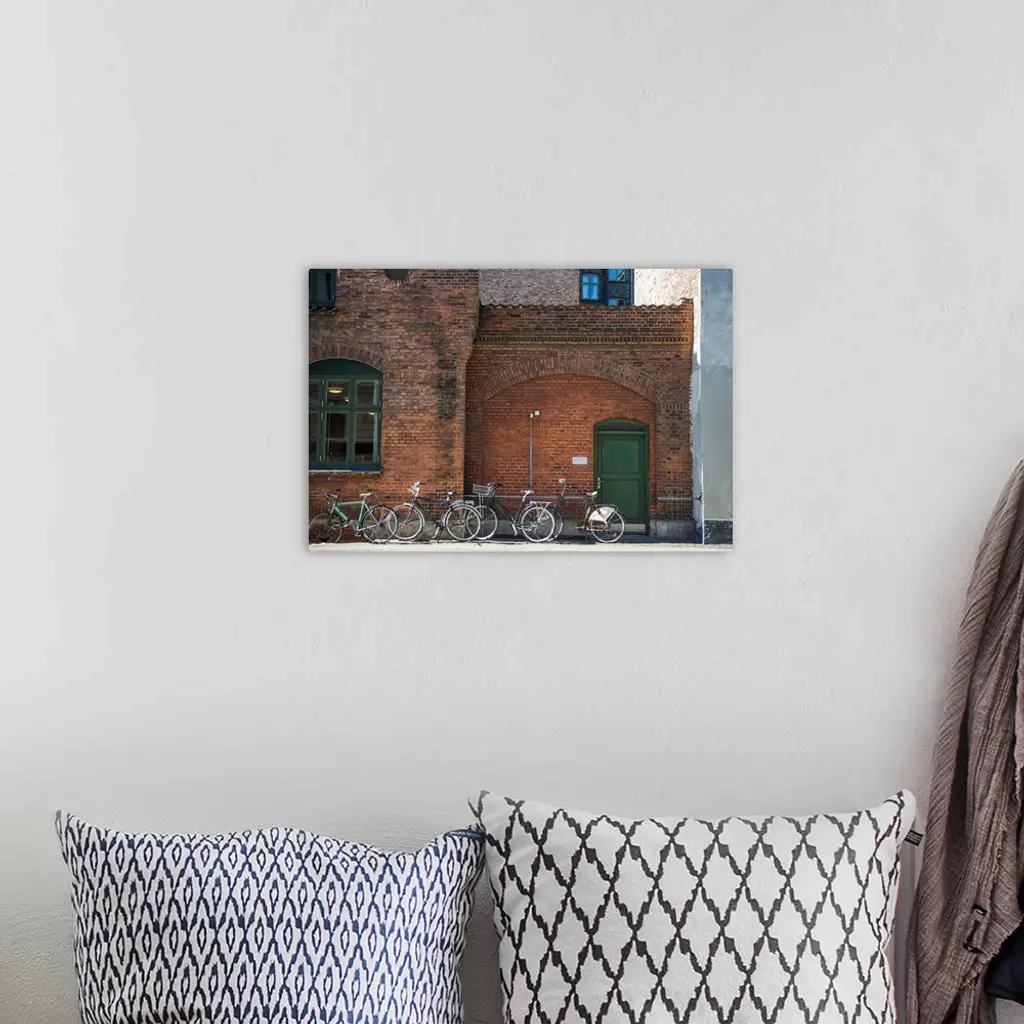 Parked Bicycles Near Brick Wall Of Building Of Copenhagen, Denmark